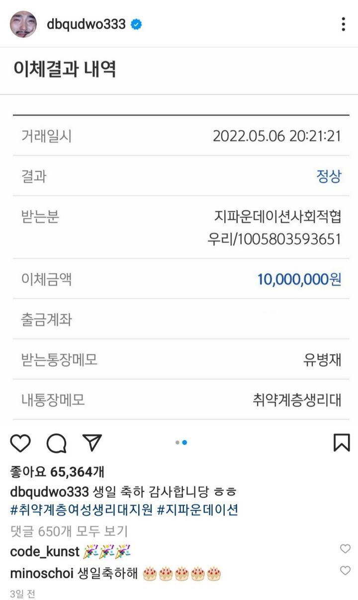[흥미돋]유병재 생일기념 기부 근황.jpg 작성자휴징|작성시간22.05.09|조회수13,214 목록 댓글 69 글자크기 작게가 글자크기 크게가 출처 : 여성시대 휴징생일 기념으로취약계층 여성 생리대 지원기부했더라태그 검색했는데 작년에도 했어서 신기 다음검색 현재 게시글 추가 기능 열기 북마크 공유하기 신고 센터로 신고 댓글 댓글 69 댓글쓰기 답글쓰기 댓글 리스트 작성자뭘봐콱씨팍 | 작성시간 22.05.10 오 ㅋㅋㅋㅋㅋㅋㅋ 안좋아했는데 대단하네 굿 작성자현생 망 | 작성시간 22.05.10 오 작성자행복한사람이야 | 작성시간 22.05.10 축하해요 작성자오메가쓰리먹는시간두시 | 작성시간 22.05.10 오ㅋㅋㅋ 생일축하한다구~~~ 작성자이초 | 작성시간 22.05.10 잘했다 댓글 전체보기