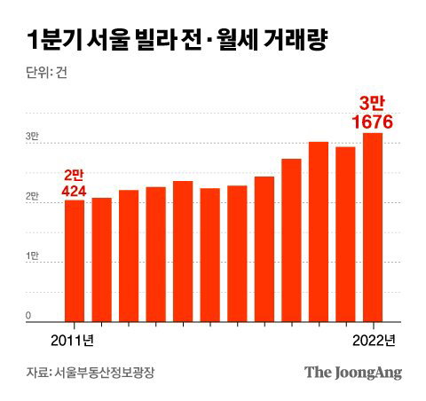 올해 1월부터 3월까지 서울 빌라(연립·다세대) 전·월세 거래량이 역대 최고치를 기록했다. 25일 부동산 정보업체 경제만랩이 서울부동산정보광장을 분석한 결과, 올해 1분기 빌라 전·월세 거래량은 3만1676건으로 서울시가 관련 통계를 작성하기 시작한 2011년 이후 1분기 기준 가장 높은 수치를 기록했다.