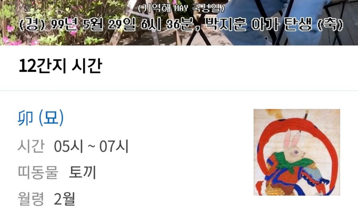 [흥미돋]토끼띠 토끼풀 토끼시에 태어난 아이돌.jpg 작성자dlwpwlrma|작성시간22.05.29|조회수17,484 목록 댓글 51 글자크기 작게가 글자크기 크게가 출처 : 여성시대 (dlwpwlrma)은 박지훈(워너원 출신 걔, 윙크남 걔)1999년은 십이간지 중 토끼띠에 해당함 5월 29일 오늘 탄생화가 토끼풀이라 함여기까진 그러려니 하는데 자컨에서 사진첩이 공개되면서 어머니께서 사진첩에 적어두신 태어난시간이 공개됐는데 6시 36분은 묘시(토끼시)트위터 구경하다 오늘 생일이래서 지인통해 어쩌다 알게된, 나만 신기할수도.. 별거 없지만 티엠아이 였음... 문제시 빛삭.. 다음검색 현재 게시글 추가 기능 열기 북마크 공유하기 신고 센터로 신고 댓글 댓글 51 댓글쓰기 답글쓰기 댓글 리스트 작성자햄즤 | 작성시간 22.05.29 인간토끼 작성자필재극기부대승 | 작성시간 22.05.29 전생에 토끼였나 작성자켘켘켘켘 | 작성시간 22.05.29 오타쿠 환장할 재질 작성자틴탑위고스탚잉락킹 | 작성시간 22.05.29 헐ㅋㅋㅋㅋㅋ 토끼풀 귀엽닼ㅋㅋ 작성자나를 잊지말아요 | 작성시간 22.12.24 왘ㅋㅋㅋㅋㅋㅋ 진짜 신기하닼ㅋㅋㅋㅋㅋㅋㅋㅋ 댓글 전체보기