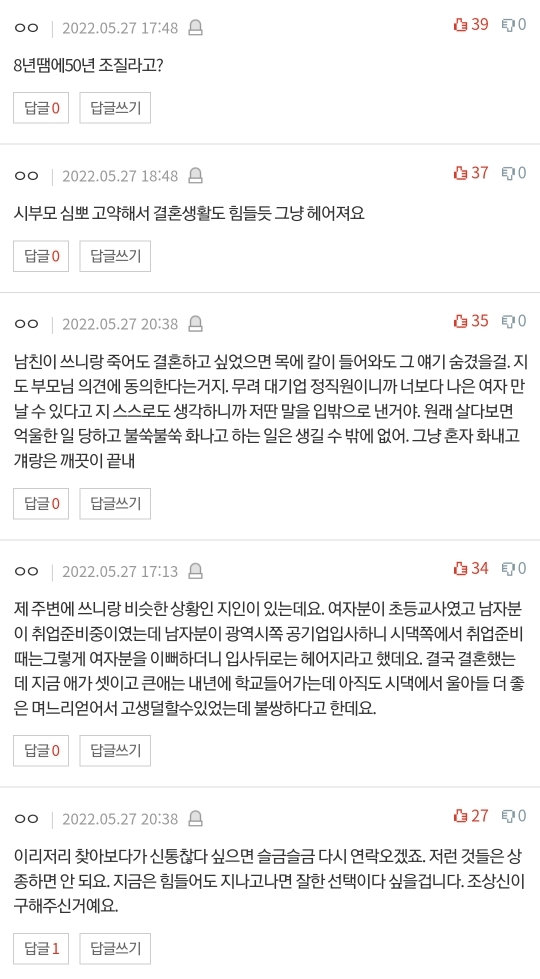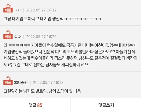 근데 그렇다고 공공기관 여자친구 무시할 레벨은 절대 아닌데 뭐지? ㅋㅋㅋㅋㅋㅋ 진짜 며느리 전문직을 바라는거면 미친거고 -