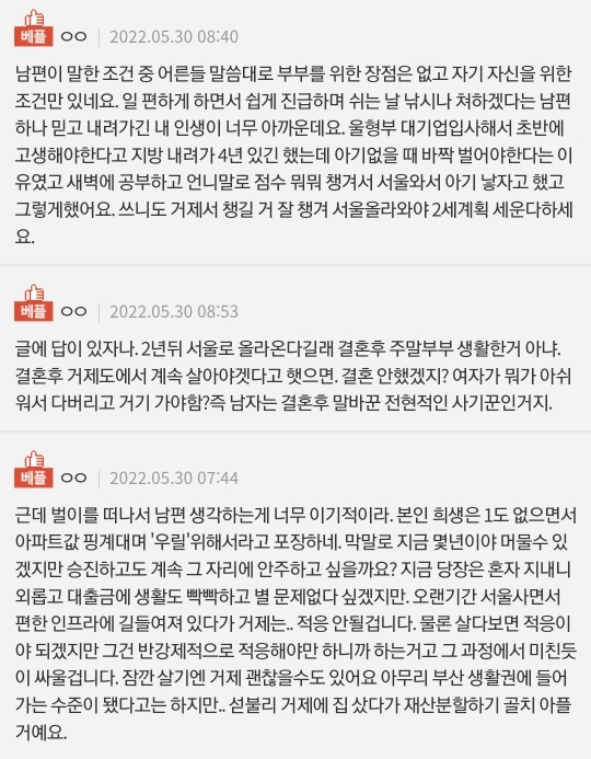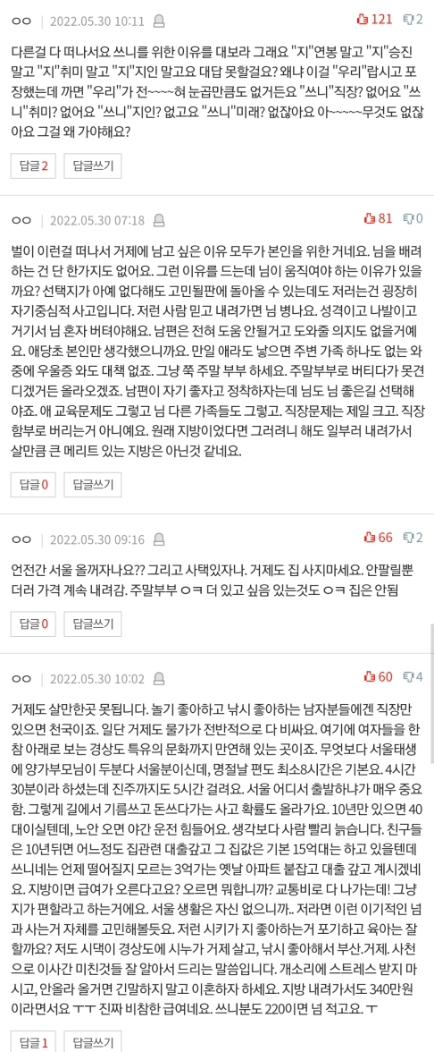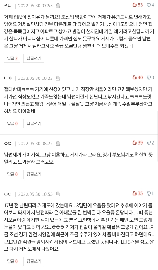 남편이가고, 시어머님이랑 친정엄마랑 이부분에 대해서 의논을 했는데 두분다 집값 제외 잘 모르겠다, 너무 멀다. 나중이라지만 너희 아기 낳으면 가까우면 우리가 한번씩 아이도 봐주고 하는데, 아무리 그래도 거제에 집사면 청약도 날라가고, 너희도 앞으로 재산이라 하면 집한채가 전부인게 현실인데 거제도 아파트가 싸다한들 그게 메리트가 있겧냐 등등 두분다 싫어하시네요.