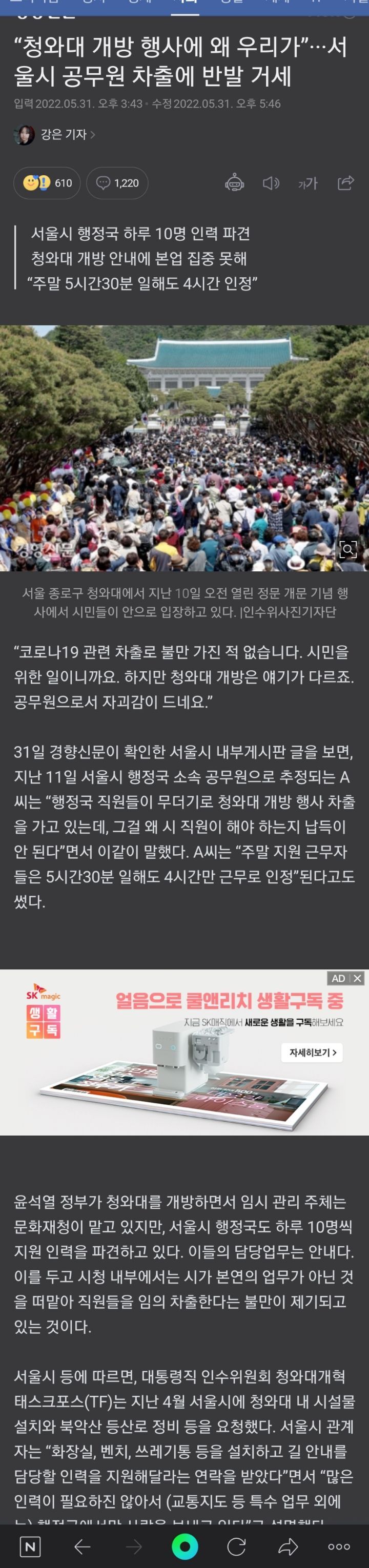 [여시뉴스데스크]청와대 개방 행사에 왜 우리가”···서울시 공무원 차출에 반발 거세 작성자현진영고진영고|작성시간22.05.31|조회수1,511 목록 댓글 5 글자크기 작게가 글자크기 크게가 출처 : http://naver.me/5HUbUnAi“청와대 개방 행사에 왜 우리가”···서울시 공무원 차출에 반발 거세“코로나19 관련 차출로 불만 가진 적 없습니다. 시민을 위한 일이니까요. 하지만 청와대 개방은 얘기가 다르죠. 공무원으로서 자괴감이 드네요.” 31일 경향신문이 확인한 서울시 내부게시판 글n.news.naver.com 다음검색 현재 게시글 추가 기능 열기 북마크 공유하기 신고 센터로 신고 댓글 댓글 5 댓글쓰기 답글쓰기 댓글 리스트 작성자뿍뿍디라라 | 작성시간 22.05.31 2찍놈들만 시켜라 작성자tunesup | 작성시간 22.05.31 개어이업네 작성자햄버거 소고기 빼고 | 작성시간 22.05.31 ㅎ…. 2찍공만 데려다 써라 작성자그래요우리집은티비가두대에요 | 작성시간 22.05.31 다들 이 기세를 몰아 1번 찍어 작성자우리둘은얼어붙지않을거야 | 작성시간 22.05.31 미챴냐고 도랐냐 ㅈㄴ싫어 댓글 전체보기
