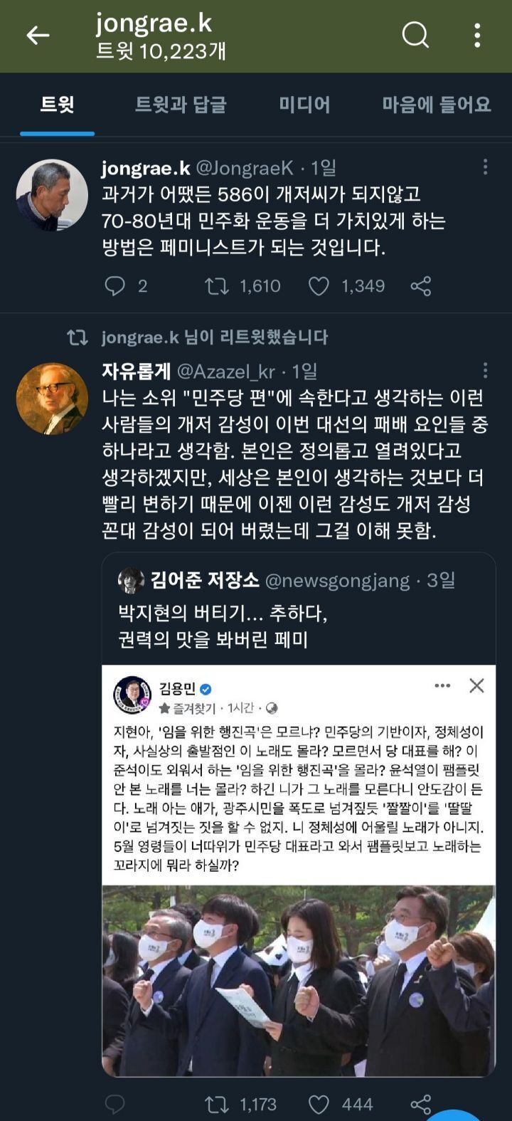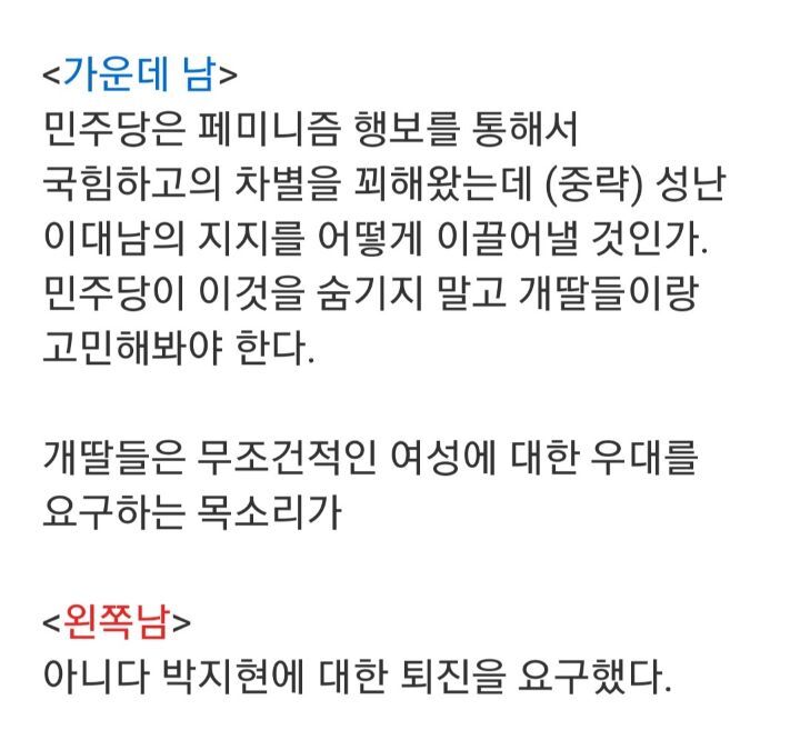 여성들의 민주당 지지율이 높기 때문에 박지현의 쇄신이 틀렸으므로 그나마 희망적이라고 함... 아마 박지현을 레디컬 페미니스트라고 생각하는 듯;; 여성 지지율 높은 것과 박지현이 틀렸다는 게 무슨 관계인지 사실 잘 모르겠음 나는 박지현 보고 민주당 뽑았는데;;