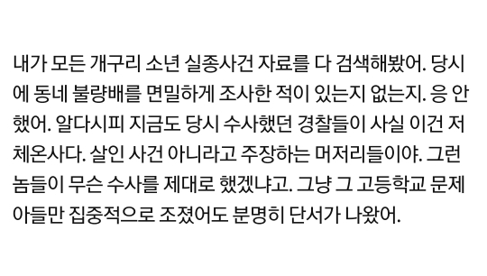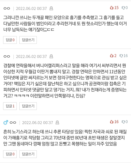 작성자뭐라고해야잘지었다고소문 작성시간 22.06.05 헐....진짜 저게 맞다면 용의자부모님중에 권력자 있었을거같은데......