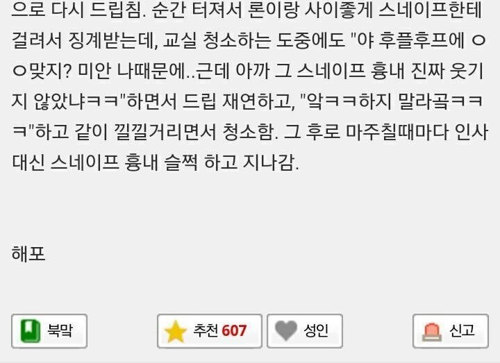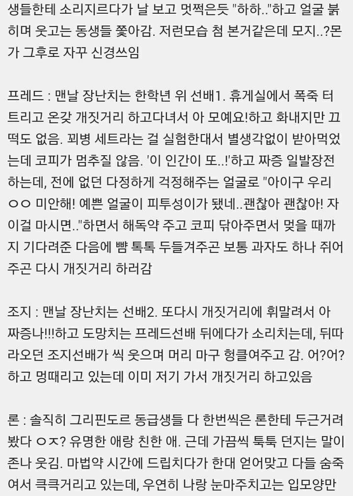 론 : 솔직히 그리핀도르 동급생들 다 한번씩은 론한테 두근거려봤다 ㅇㅈ? 유명한 애랑 친한 애. 근데 가끔씩 툭툭 던지는 말이 존나 웃김. 마법약 시간에 드립치다가 한대 얻어맞고 다들 숨죽여서 큭큭거리고 있는데, 우연히 나랑 눈마주치고는 입모양만으로 다시 드립침. 순간 터져서 론이랑 사이좋게 스네이프한테 걸려서 징계받는데, 교실 청소하는 도중에도 "야 후플후프에 ㅇㅇ맞지? 미안 나때문에..근데 아까 그 스네이프 흉내 진짜 웃기지 않았냐ㅋㅋ"하면서 드립 재연하고, "앜ㅋㅋ하지 말라곸ㅋㅋㅋ"하고 같이 낄낄거리면서 청소함. 그 후로 마주칠때마다 인사 대신 스네이프 흉내 슬쩍 하고 지나감.