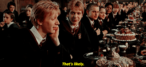 프레드 : 맨날 장난치는 한학년 위 선배1. 휴게실에서 폭죽 터트리고 온갖 개짓거리 하고다녀서 아 모예요!하고 화내지만 끄떡도 없음. 꾀병 세트라는 걸 실험한대서 별생각없이 받아먹었는데 코피가 멈추질 않음. '이 인간이 또..!'하고 짜증 일발장전하는데, 전에 없던 다정하게 걱정해주는 얼굴로 "아이구 우리 ㅇㅇ 미안해! 예쁜 얼굴이 피투성이가 됐네..괜찮아 괜찮아! 자 이걸 마시면.."하면서 해독약 주고 코피 닦아주면서 멎을 때까지 기다려준 다음에 뺨 톡톡 두들겨주곤 보통 과자도 하나 쥐어주곤 다시 개짓거리 하러감