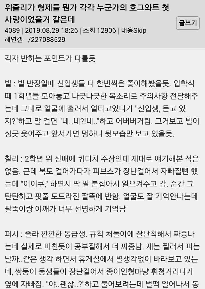 찰리 : 2학년 위 선배에 퀴디치 주장인데 제대로 얘기해본 적은 없음. 근데 복도 걸어가다가 피브스가 장난걸어서 자빠질뻔 했는데 "어이쿠," 하면서 딱 팔 붙잡아서 일으켜주고 감. 순간 그 탄탄하고 핏줄 도드라진 팔뚝에 반함. 얼굴도 잘 기억안나는데 팔뚝이랑 어깨가 너무 선명하게 기억남