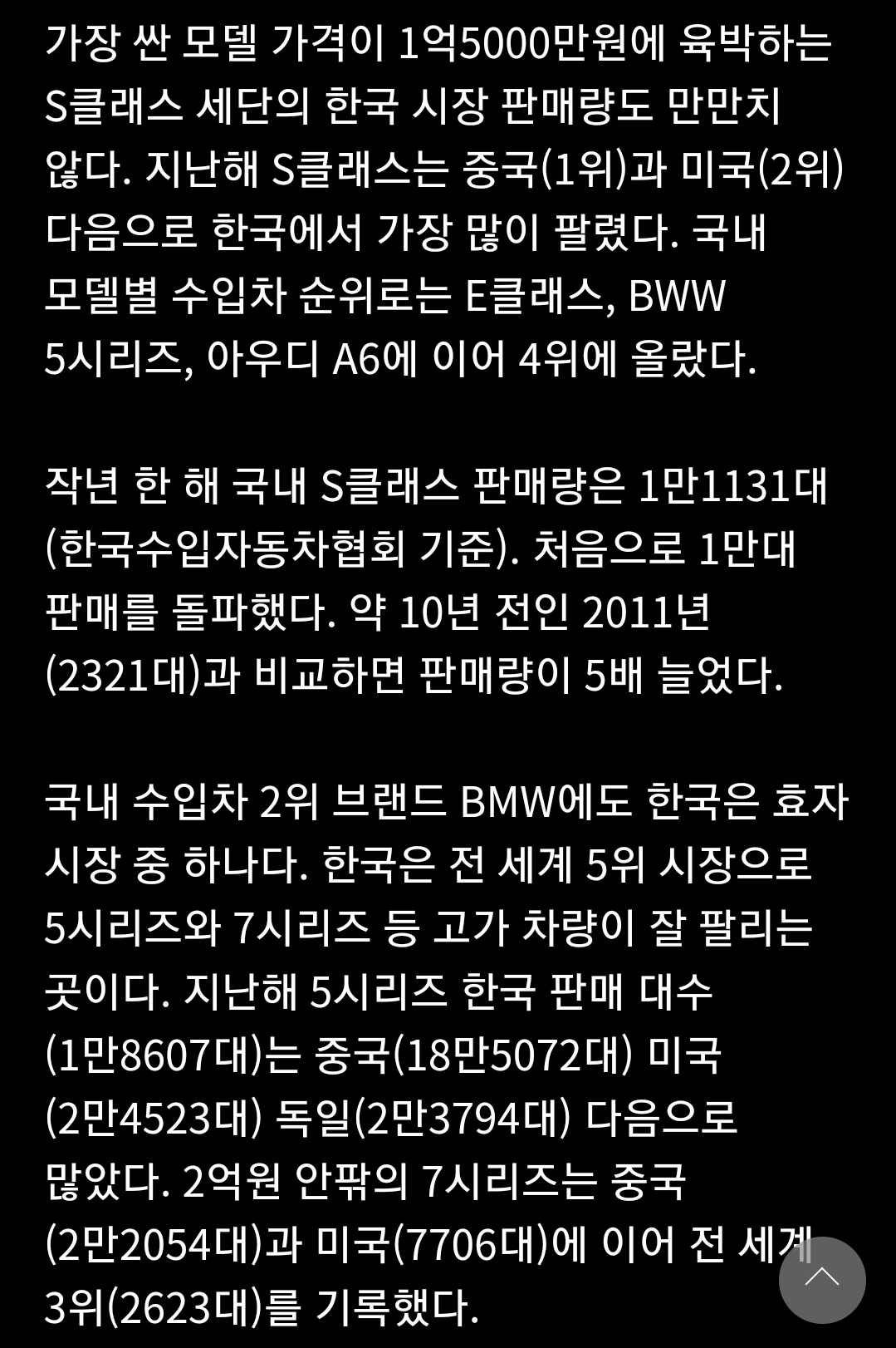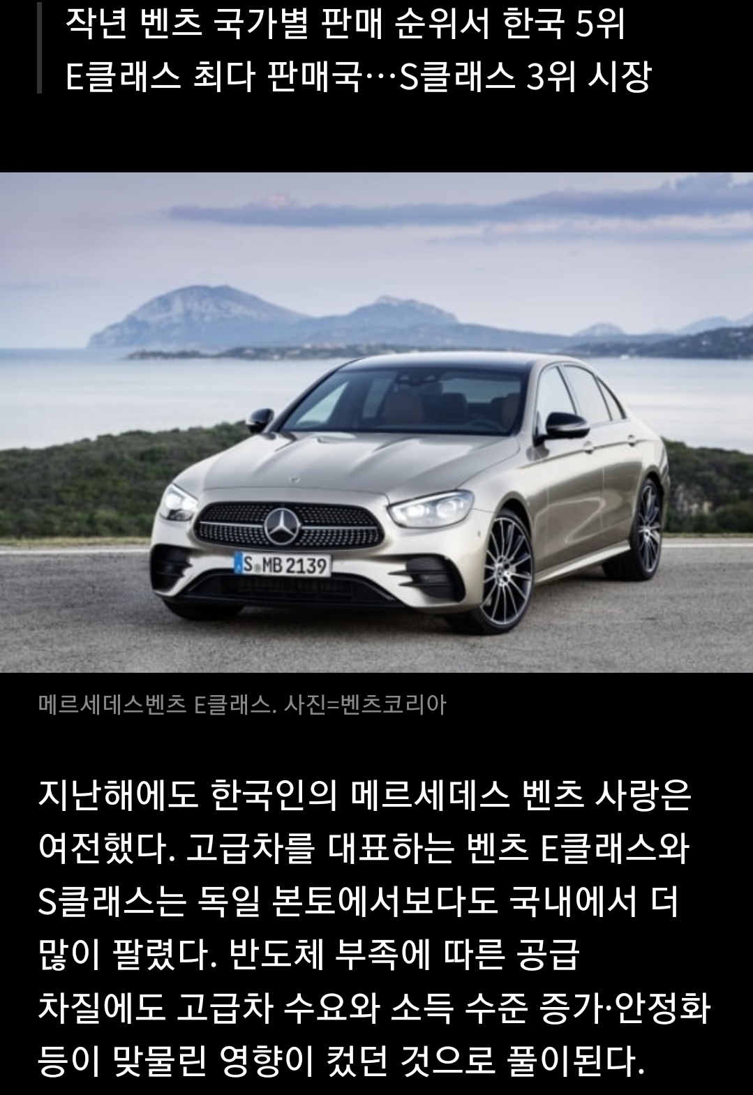 [여시뉴스데스크]한국의 '유별난 벤츠 사랑'…E·S클래스, 본고장보다 더 팔린다 작성자시러비카노|작성시간22.06.08|조회수8,989 목록 댓글 19 글자크기 작게가 글자크기 크게가 출처 : https://www.hankyung.com/economy/article/202202220527g한국의 '유별난 벤츠 사랑'…E·S클래스, 본고장보다 더 팔린다한국의 '유별난 벤츠 사랑'…E·S클래스, 본고장보다 더 팔린다, 작년 벤츠 국가별 판매 순위서 한국 5위 E클래스 최다 판매국…S클래스 3위 시장www.hankyung.com전문은 출처로 다음검색 현재 게시글 추가 기능 열기 북마크 공유하기 신고 센터로 신고 댓글 댓글 19 댓글쓰기 답글쓰기 댓글 리스트 작성자uiuil | 작성시간 22.06.08 as.. 끔찍 작성자인프피를 사랑해주세요 | 작성시간 22.06.08 나두 이클ㅋㅋㅋ.. 이번달에 나온대,, 작성자파랗게푸르게 | 작성시간 22.06.09 오지게 이쁨 작성자뽀 | 작성시간 22.06.09 왜냐믄 한국차도 그만한건 비싸 ㅋㅋㅋㅋㅋㅋㅋ 그리고 고장이 잘 안나 글구 기존벤츠유저한테는 차바꿀때 할인도 해줘 ㅋㅋㅋ 그러니 계속 벤츠사게 됨 작성자홍삼스틱맛아몬드 | 작성시간 22.06.10 근데 솔직히 가성비 젤 좋음. 댓글 전체보기