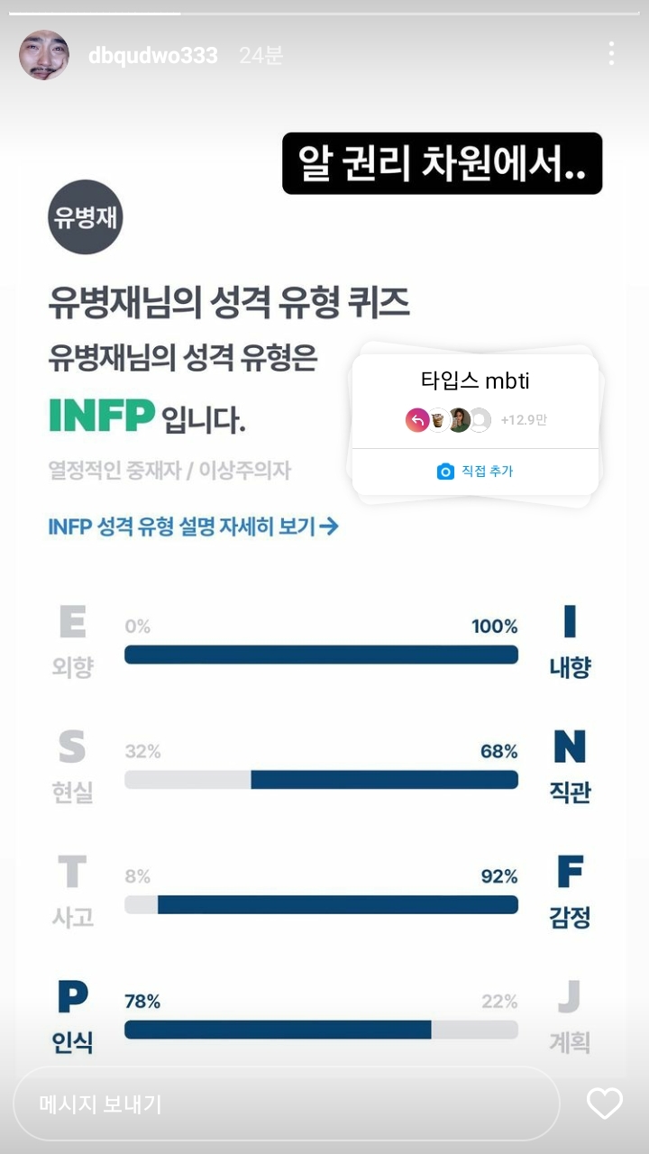 [기타]유병재 mbti 작성자미로찾기|작성시간22.06.09|조회수16,520 목록 댓글 61 글자크기 작게가 글자크기 크게가 출처 : https://instagram.com/stories/dbqudwo333/2856785724599390972?igshid=MDJmNzVkMjY= 다음검색 현재 게시글 추가 기능 열기 북마크 공유하기 신고 센터로 신고 댓글 댓글 61 댓글쓰기 답글쓰기 댓글 리스트 작성자영앤핸썸빅앤 | 작성시간 22.06.09 이미지 확대 작성자마마슬푸노 | 작성시간 22.06.10 아....ㅎ.. 작성자도지사김동연 | 작성시간 22.06.10 아니 100니 나올 수 있는거였다니 작성자ilililioiove | 작성시간 22.06.10 ... 작성자미나리꽃 | 작성시간 22.09.09 저 사이트로 하니까 나도 100퍼 나오긴한다 댓글 전체보기