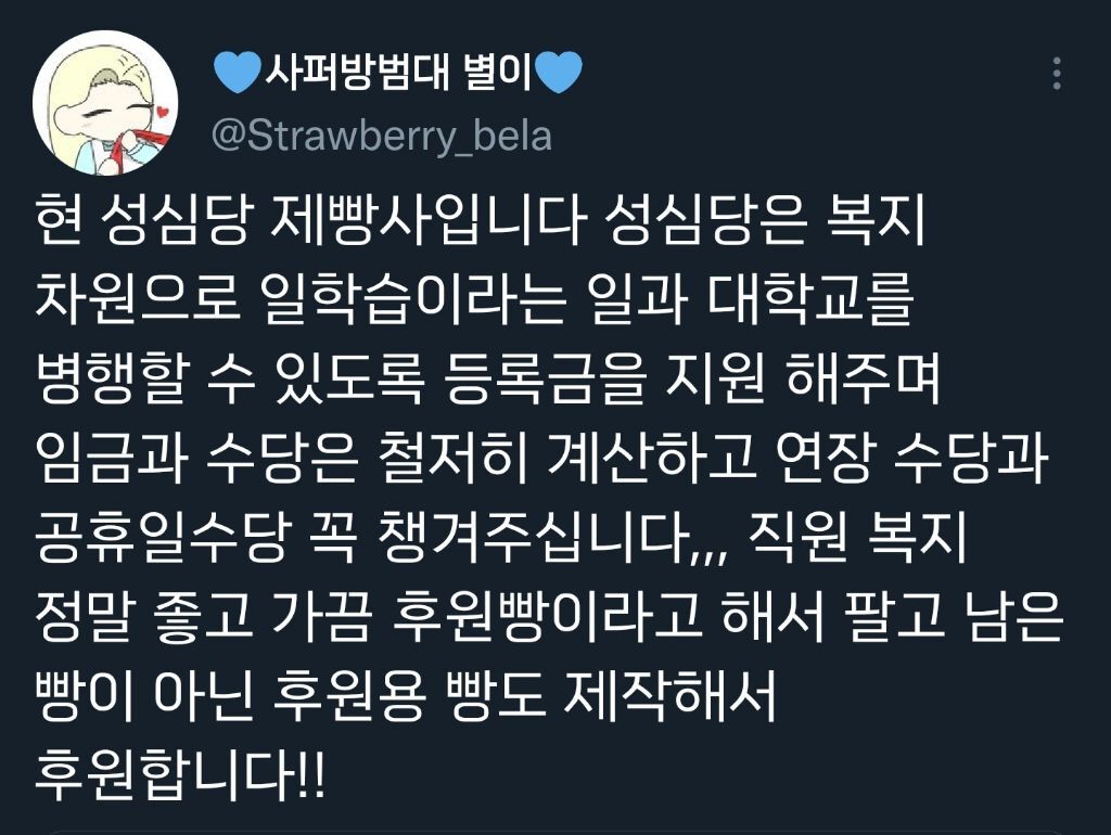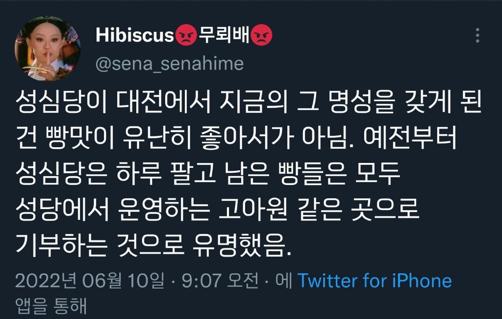 [흥미돋]성심당이 대전에서 유명해진 계기는 빵맛이 유난히 좋아서가 아님.twt 작성자타인을베려하는마음|작성시간22.06.11|조회수72,357 목록 댓글 319 글자크기 작게가 글자크기 크게가 출처 : 여성시대 타인을베려하는마음https://twitter.com/Strawberry_bela/status/1535191925535346688?t=sgOi20obDxYeEuw3I9y0Cw&s=09https://twitter.com/sena_senahime/status/1535050929783078912?t=-ZI05rCP35Mrz_5GZVkuZg&s=19 다음검색 현재 게시글 추가 기능 열기 북마크 공유하기 신고 센터로 신고 댓글 댓글 319 댓글쓰기 답글쓰기 댓글 리스트 작성자연구름이 | 작성시간 22.06.13 성심당 최고다..♥ 작성자잘살자진짜좀 | 작성시간 22.06.13 아 여기 빵 진짜 넘. 맛있어 케이크도 진짜 너무 맛있어 케익먹고싶을때마다 생각나 작성자기사시험합격 | 작성시간 22.06.14 ㅠㅠ 눈뭏나 작성자개예민boss | 작성시간 22.06.16 진짜 미쳣다개맛잇건데 작성자스피또1등당첨되게해주세요 | 작성시간 22.10.12 오 멋지다 정말,, 댓글 전체보기