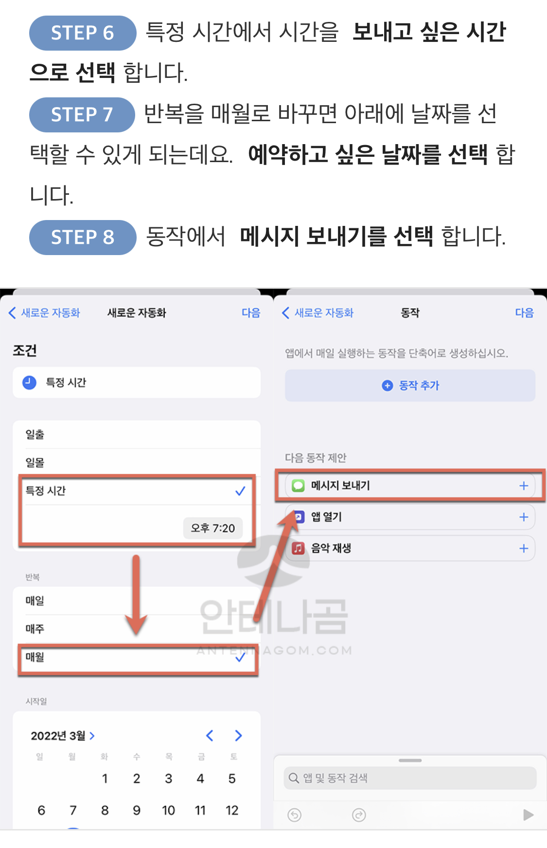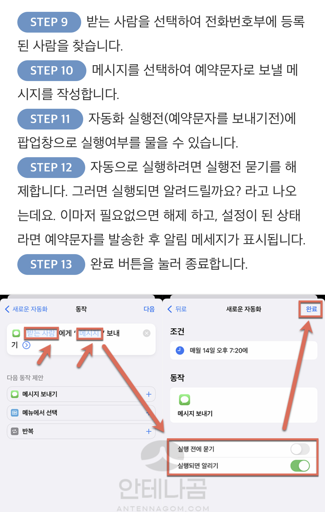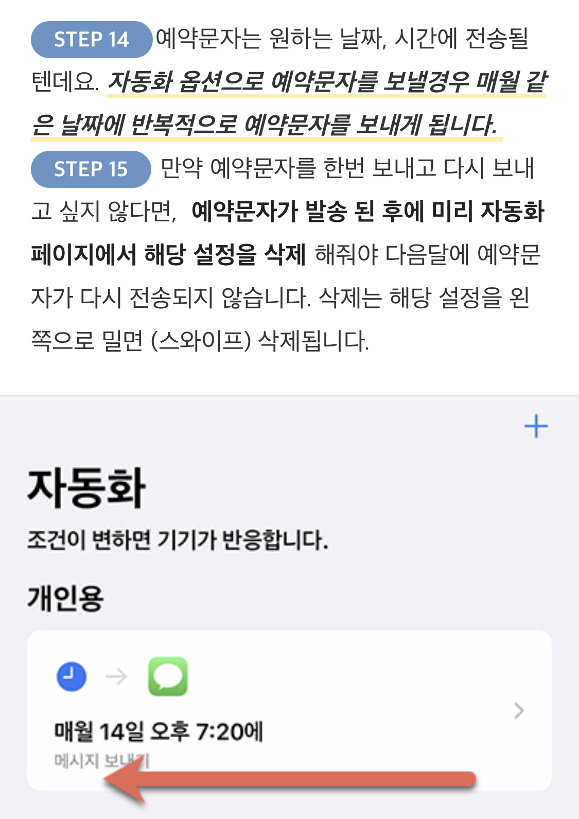 [스크랩] [흥미돋]아이폰 예약문자 보내는 법 작성자홀리갈링|작성시간22.06.11|조회수10,969 목록 댓글 8 글자크기 작게가 글자크기 크게가 출처 : https://antennagom.com/1097아이폰 예약문자 보내는 방법아이폰 예약문자 보내는 방법 - 아이폰을 사용하다보면 당연히 있을 것 같은 기능이 없는 경우가 있습니다. 그 중에 하나가 예약된 시간에 문자를 보내도록 하는 예약문자 기능인데요. 이상하게antennagom.com글작성자 무시하고 욕하셔도 됩니다 다음검색 스크랩 원문 : *여성시대* 차분한 20대들의 알흠다운 공간 현재 게시글 추가 기능 열기 북마크 공유하기 신고 센터로 신고 댓글 댓글 8 댓글쓰기 답글쓰기 댓글 리스트 작성자치과관련글에댓글다는거좋아하는여시 | 작성시간 22.06.11 개불편해.. 작성자아이스페더 | 작성시간 22.06.11 굉장히 불편하네 그냥 엄마걸로 보낼게.. 작성자위로고마워(네가뭘알아) | 작성시간 22.06.11 오우… 너무 어려운데… 작성자도지사김동연 | 작성시간 22.06.11 오.. 어려운데.. ㅋ 작성자수뇌부 | 작성시간 22.08.27 덕분에 예약문자 설정했어 고마워!! 댓글 전체보기