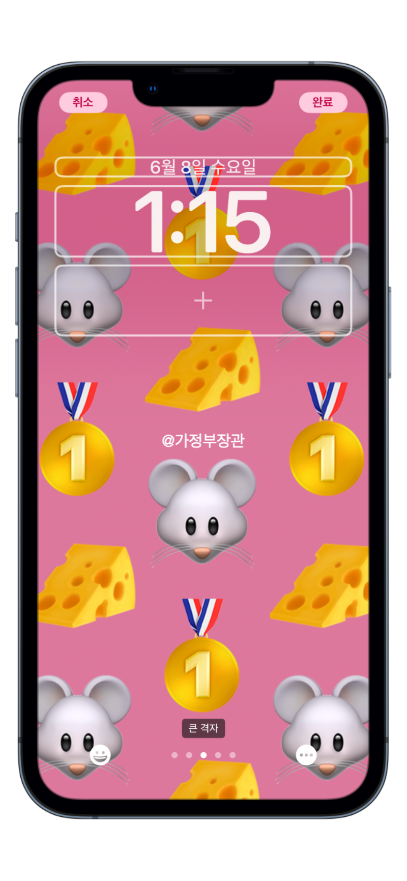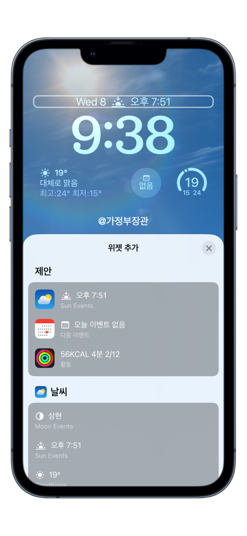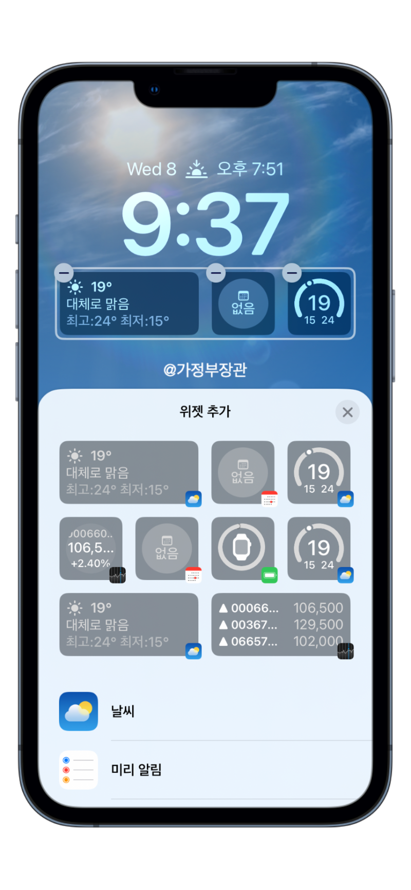 위젯커스텀에 들어가보면 역시 애플스럽게(?) 상단의 시계를 기준으로 위 아래 부분에만 위젯을 제한시켰습니다. 자유로운 위치 이동을 할 순 없죠. 작은 공간 내부에서 위젯을 선택 배치할 수 있게 되었습니다.