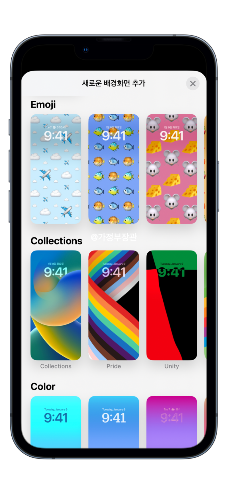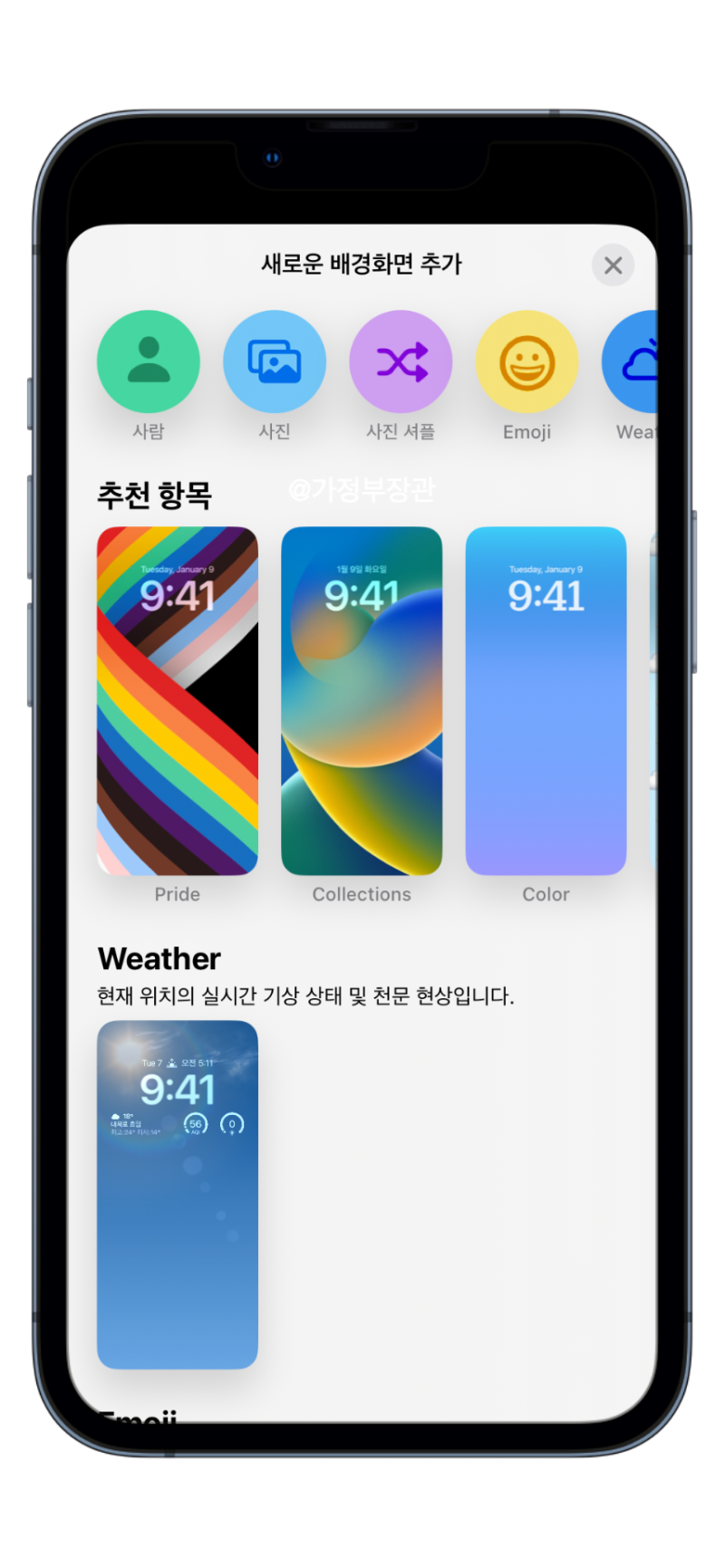 잠금화면을 길게 누르면 잠금화면 커스터마이징 화면이 나타납니다. 애플워치와 유사합니다. 새로운 배경화면 추가에 들어가면 다양한 커스터마이징을 할 수 있는데요 기본적인 배경화면부터 이모지, 그라데이션 등 재미있는 스타일을 제공합니다.