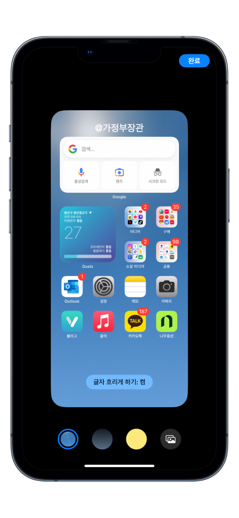 추가로 위젯을 추가하는 공간의 제약이 아쉬운데요. 자유로운 배치를 막았다면 적어도 위젯 부분을 좌우, 또는 상하 스와이프해서 추가 위젯을 볼 수 있게 하면 좋겠다 라는 생각도 들었습니다. 그런데 또 이렇게 하면 카메라 앱 제스쳐와 겹치는 부분이 있겠네요... (그건 개발자 니들이 알아서 헿 )