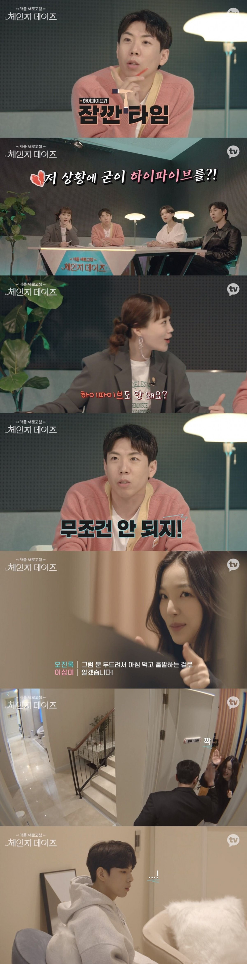 여기서 하이파이브한 둘이 내일 데이트 예정,안에 있는 둘이 커플인 상황 라면먹자고 하니까 통했다고 하이파이브