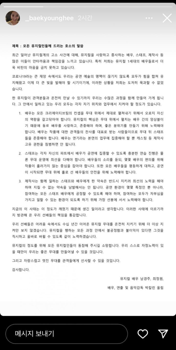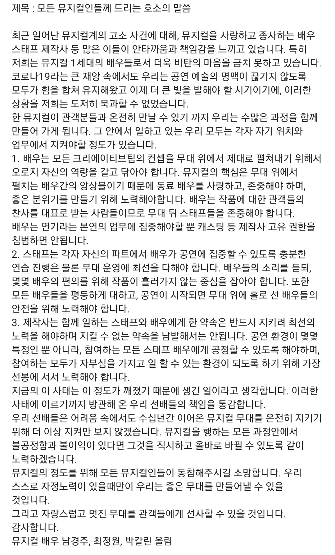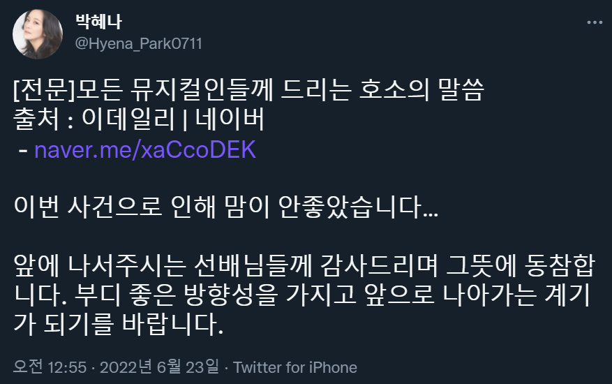 작성자제기차고 재기하세요 작성시간 22.06.25 1세대들한테 고인물이라는 둥 왜 개인만 붙잡고 난리냐는 둥 논점흐리는 사람있던데 성명문을 제대로 읽긴 한건지 ㅋㅋㅋㅋㅋㅋㅋ나도 일개 뮤덕이라 내부사정 모르지만 대체 뭘 위해서 마구잡이로 쉴드 치고 다니는 건지ㅋ...