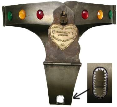 국부를 지키는 판의 앞 뒤에는 생리적인 쓰임을 위한 작은 구멍이 두개 뚫려 있는데, 그 구멍의 주위는 날카로운 가시 모양으로 되어있어서 불순한 생각을 가진 자가 손가락을 넣을 수 없도록 되어있었어요.