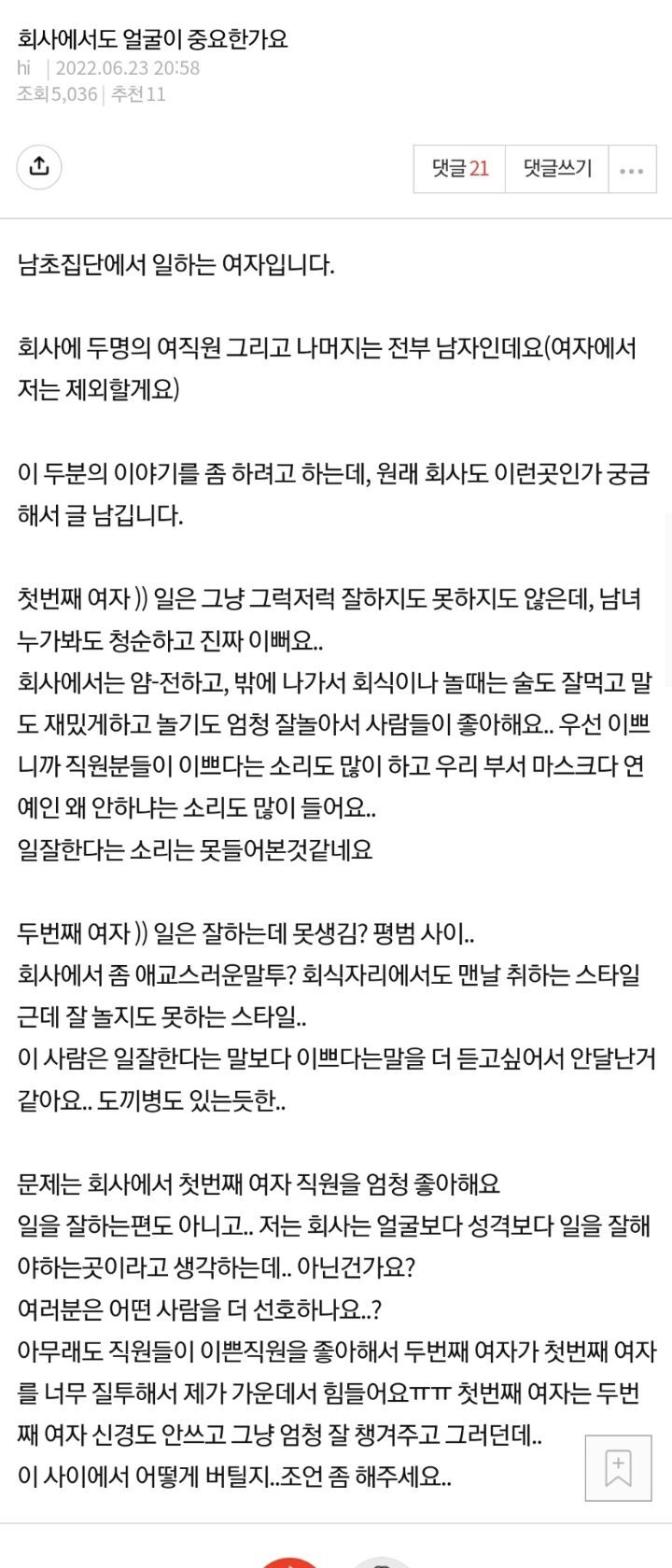 작성자홀리패션 작성시간 22.06.26 어후.. 불편하다 ㅋㅋ 외모평가 ㅋㅋ 여자직원들 평가에 애교에 성격싹싹한거 다 나오네;;; 남자직원들 평가할때는 오로지 성과만 보면거 참.. 여기서 1번이 괜찮다 2번이 괜찮다 누가 더 이해간다 이런말 안하고 싶다
