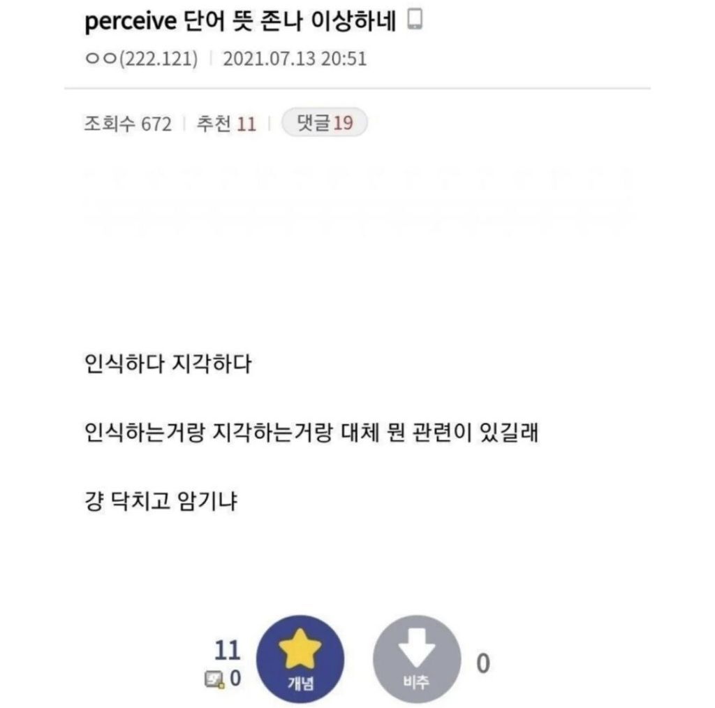 [흥미돋]perceive 단어 뜻 ㅈㄴ 이상하네 작성자토스뱅크|작성시간22.06.28|조회수17,505 목록 댓글 34 글자크기 작게가 글자크기 크게가 출처 : 여성시대 토스뱅크 다음검색 현재 게시글 추가 기능 열기 북마크 공유하기 신고 센터로 신고 댓글 댓글 34 댓글쓰기 답글쓰기 댓글 리스트 작성자이번주로또는저에요 | 작성시간 22.06.28 ㅠ이게 한국 교육현실이구나 작성자19남음 | 작성시간 22.06.28 하.... 작성자점심시간두시간플리즈 | 작성시간 22.06.28 아 병신아.. 작성자dmlaldjqtek | 작성시간 22.06.28 모국어도 잘 모르는데 영어를 배운다는게 웃긴다 작성자살아남자5년간 | 작성시간 22.06.28 와.. 댓글 전체보기