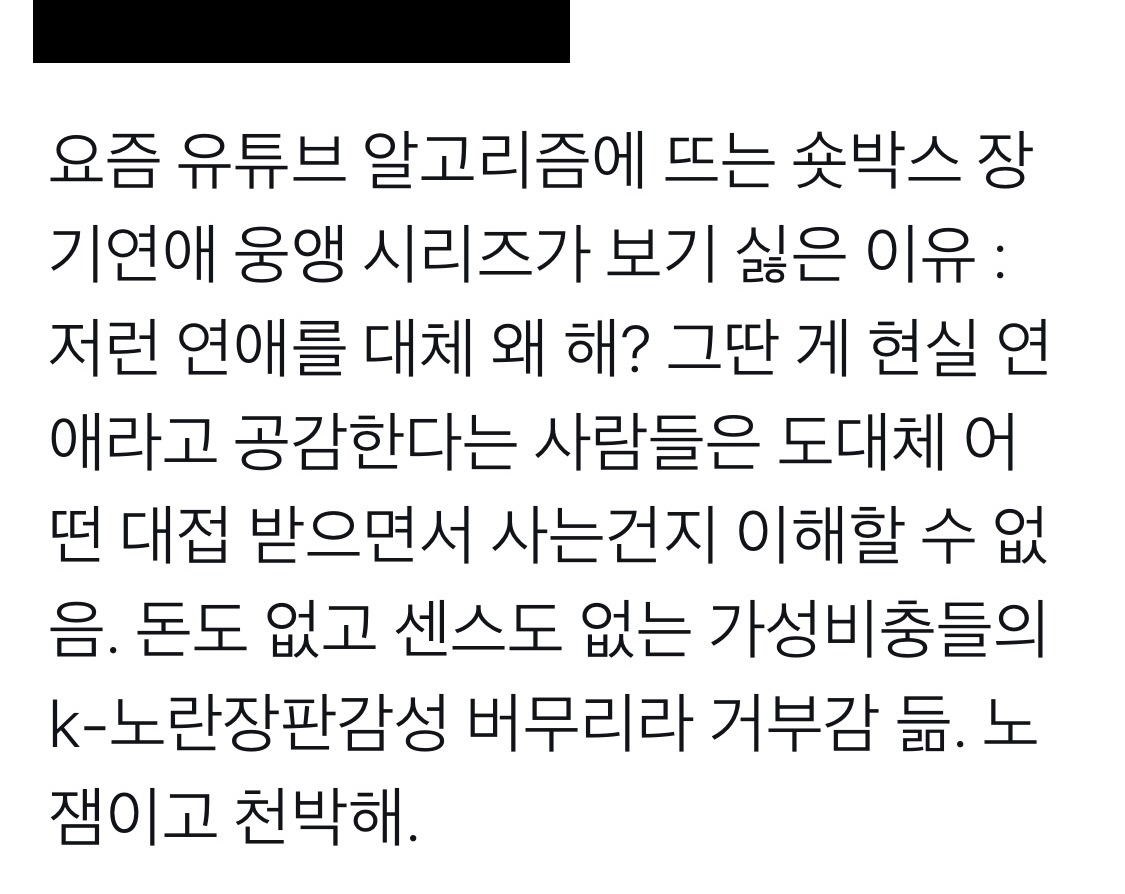 [스크랩] [흥미돋]유튜브 숏박스 장기연애 시리즈가 싫은 이유 작성자한쳐돌이|작성시간22.06.30|조회수24,307 목록 댓글 85 글자크기 작게가 글자크기 크게가 출처 : 여성시대 내 꿈은 부동산 부자 다음검색 스크랩 원문 : *여성시대* 차분한 20대들의 알흠다운 공간 현재 게시글 추가 기능 열기 북마크 공유하기 신고 센터로 신고 댓글 댓글 85 댓글쓰기 답글쓰기 댓글 리스트 작성자Save하면Shit된다 | 작성시간 22.06.30 본적있는데 매 장면마다 아 싫다 진짜 싫다 으 소리 계속 나오던데 작성자계획하는중 | 작성시간 22.06.30 제대로 본적은 없고 하도 쇼츠나 인스타에 올라와서 짤만 몇개봤는데도 딱 알거같음ㅋㅋㅋ 한남감성,,, 작성자마팔광 | 작성시간 22.06.30 더치에 미쳤던데 ㅋㅋㅋㅋ 삭제된 댓글입니다. 답댓글 작성자개똥아똥사니아니오 | 작성시간 22.07.13 22 아이큐떨어지는ㅋㅋㅋㅋ개공감 댓글 전체보기