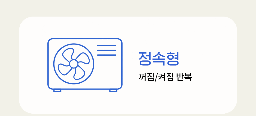 정속형은 실내가 더우면 실외기가 빠르게 돌다가 희망온도만큼 시원해지면 실외기가 꺼지고, 실내가 다시 더워지면 빠르게 돌기를 반복해요. 반면 인버터는 희망온도만큼 시원해지더라도 실외기가 아예 꺼지지 않고 절전모드를 유지하며 천천히 꾸준~하게 계속 돌아가죠. 이런 차이 때문에 두 에어컨은 각각 전기요금 아끼는 법이 다르답니다.