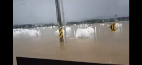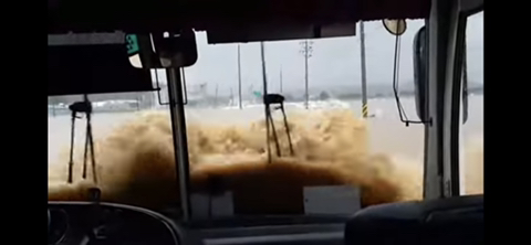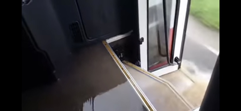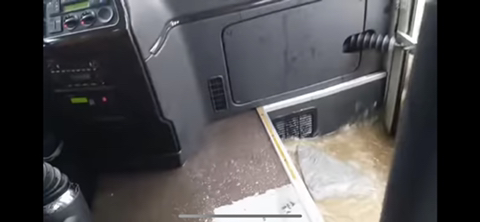버스 앞문에는 이미 물이 출렁출렁...들어옴