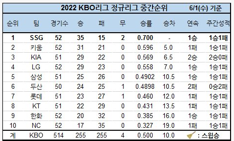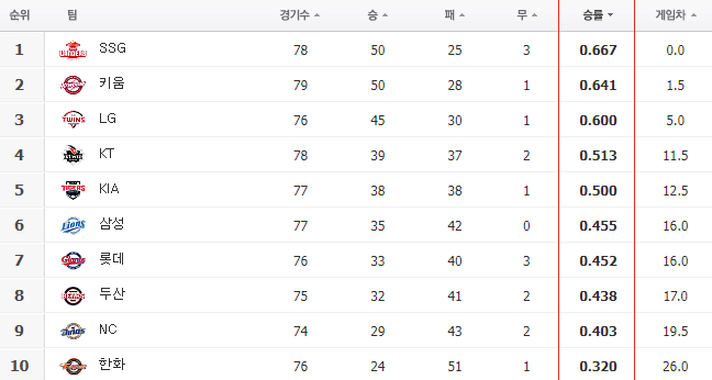 우천취소되면 게임차가 벌어지는 상위권 싸움