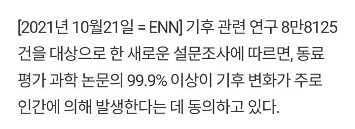 99퍼 논문들 기후변화가 빙화기처럼 지구의 기후 변화 주기 도래 태양어쩌고 이딴게 아니라 인간 때문 이라는데에 동의함
