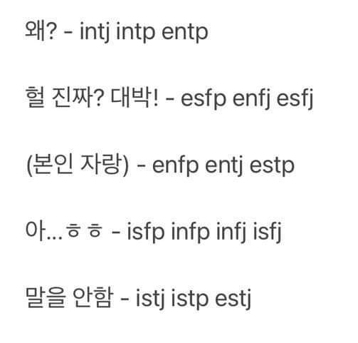 [흥미돋]MBTI 별 좋아하는 사람 앞에서 자주하는 말 작성자은해|작성시간22.07.09|조회수10,754 목록 댓글 38 글자크기 작게가 글자크기 크게가 출처 : 여성시대 은해entp 친구 말로는...질문의 수 = 너에 대한 관심의 척도재미로만 봐주세요 다음검색 현재 게시글 추가 기능 열기 북마크 공유하기 신고 센터로 신고 댓글 댓글 38 댓글쓰기 답글쓰기 댓글 리스트 작성자어휴시이발 | 작성시간 22.07.09 enfp ㅋㅋ 너진짜귀엽다 작성자자기암시 | 작성시간 22.07.09 아..ㅎㅎ 인정임 ㅅㅂㅋㅋㅋㅋㅋㅋㅋㅋ 작성자전예서 | 작성시간 22.07.09 intp 찐입니다... ㅇㅈ 작성자3;03AM | 작성시간 22.07.09 아..ㅎㅎ <이거 진짜ㅋㅋㅋㅋㅋㅋ부끄러워서 + 말실수 할까봐 말을 아끼게 됨센스있고 재밌는 대답하고 싶은데 괜히 말실수해서 점수 깎이면 어떡해 작성자서치fun | 작성시간 22.07.09 ㅇㄱㄹㅇ 댓글 전체보기
