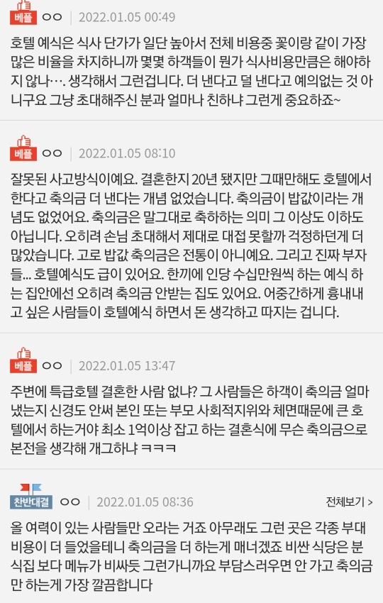 작성자곱창볶음밥이랑소주 작성시간 22.07.11 애초에 비싼호텔에서한사람들은 축의금땡길 생각을 안햐요