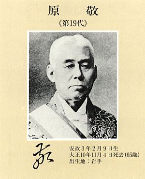 총리 재직 중인 1921년 11월 4일에 도쿄역에서 나카오카 곤이치(1903년 ~ 1980년)라는 청년의 칼에 찔려 죽었는데, 극우 범죄 단체의 소행이었다. 조금 황당하게도 하찮은 민간인이 천황가의 혼인 문제에 관여했다는 이유였다고 한다. 당시 황태자비 선정에 불만을 가진 야마가타 아리토모가 배후에서 방해 공작을 펼쳤다. 이것이 발각되어 야마가타가 난처해지자 평소 친분이 있었던 하라가 해명하고 중재를 해준 일이 있었다.