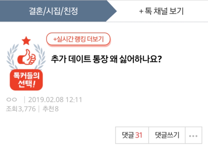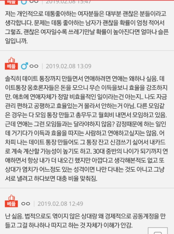 방금 데이트통장 관련글을 봤는데 남자분이 좀 얄밉고 찌질하게 굴긴했지만데이트통장 하는 자체에대해서는 베플들처럼 욕먹을것 까지인가 생각이 들어 글올립니다.데이트통장 하는사람은 아예 걸러야된다느니 얘기들이 많아서요.