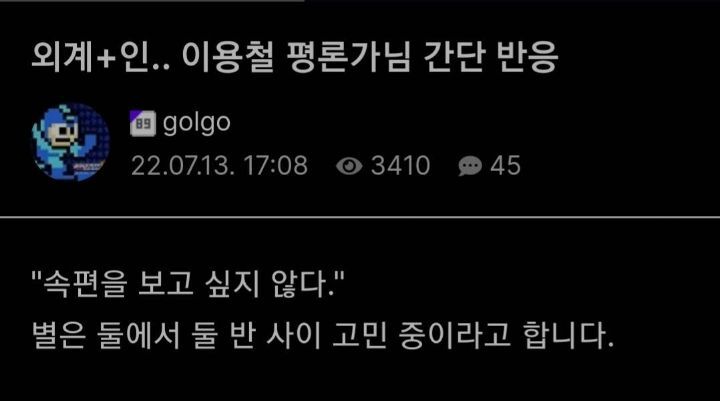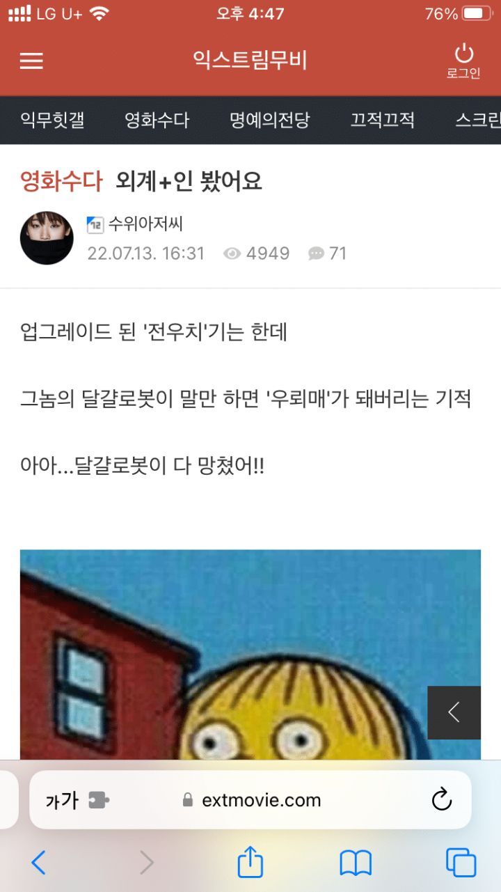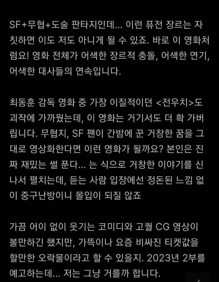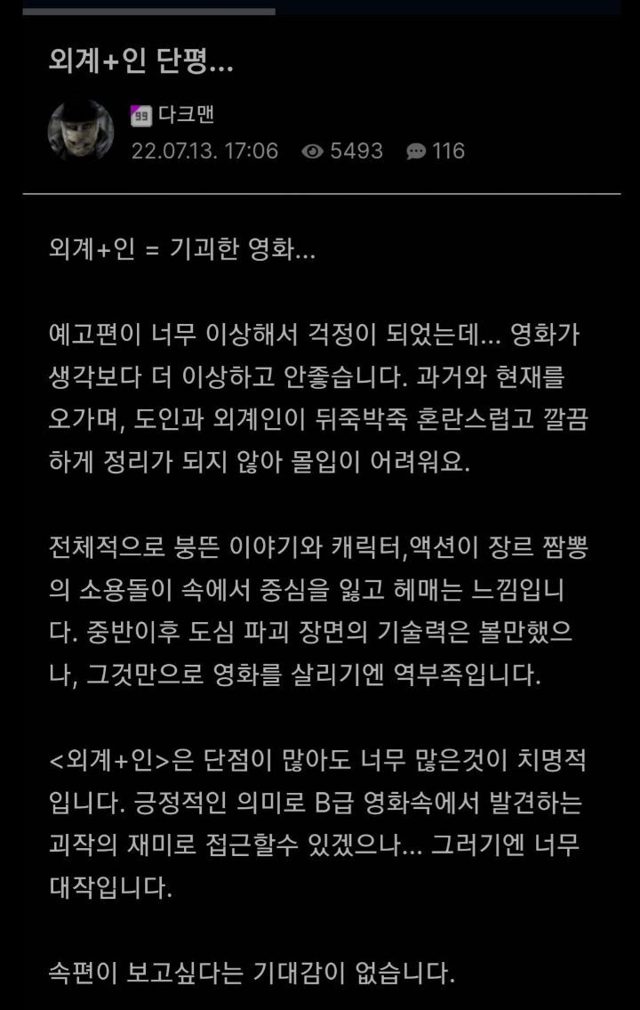 [흥미돋]오늘 올라온 '외계+인' 언론시사회 반응 작성자알아서빠져라|작성시간22.07.13|조회수11,544 목록 댓글 49 글자크기 작게가 글자크기 크게가 출처 : https://theqoo.net/2515667933오늘 올라온 '외계+인' 언론시사회 반응 - 스퀘어 카테고리https://img.theqoo.net/rNDmr https://img.theqoo.net/AWFED https://img.theqoo.net/kjkpP https://img.theqoo.net/MDVUS https://img.theqoo.net/zKYfOtheqoo.net 다음검색 현재 게시글 추가 기능 열기 북마크 공유하기 신고 센터로 신고 댓글 댓글 49 댓글쓰기 답글쓰기 댓글 리스트 작성자지우개 | 작성시간 22.07.13 남주를 도대체 왜 류를 쓰는데.. 그거부터 존나 노이해 작성자곰돌이뿌우 | 작성시간 22.07.13 믿고 보는 최동훈 작성자긴꿈을벗어나 | 작성시간 22.07.14 전우치 감독이라서 보고싶었는데 류 때문에 망설여지는데 평까지 안좋으니 흠.. 작성자당신은 멋져. 아무튼 누군지 몰라도 | 작성시간 22.07.14 예고편만봐도 영화안에 두개의 영화가 있는느낌 작성자넥선풍기시원한가요 | 작성시간 22.07.14 ㄹ 만 아니었어도 .. 댓글 전체보기