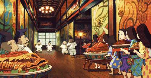 치히로가 처음 마법의 나라에 갇혀, 몸이 사라져 갈 때 하쿠가 음식을 주지요.