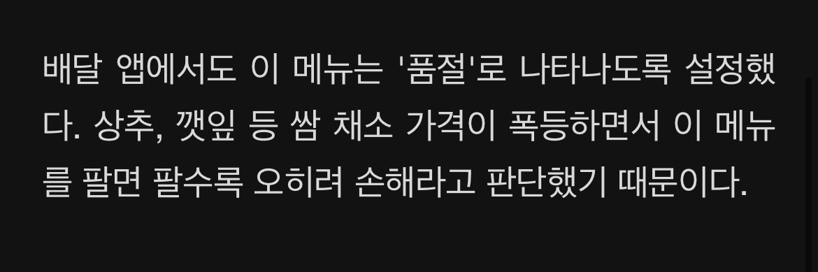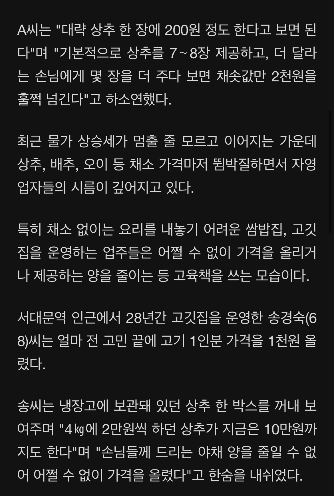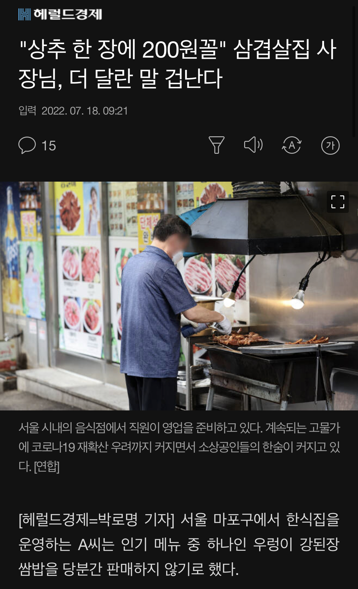[여시뉴스데스크]"상추 한 장에 200원꼴" 삼겹살집 사장님, 더 달란 말 겁난다 작성자클다엿엿|작성시간22.07.18|조회수14,469 목록 댓글 17 글자크기 작게가 글자크기 크게가 출처 : https://v.kakao.com/v/20220718092137099?from=newsbot"상추 한 장에 200원꼴" 삼겹살집 사장님, 더 달란 말 겁난다[헤럴드경제=박로명 기자] 서울 마포구에서 한식집을 운영하는 A씨는 인기 메뉴 중 하나인 우렁이 강된장 쌈밥을 당분간 판매하지 않기로 했다. 배달 앱에서도 이 메뉴는 '품절'로 나타나도록 설v.kakao.com전문 출처로 다음검색 현재 게시글 추가 기능 열기 북마크 공유하기 신고 센터로 신고 댓글 댓글 17 댓글쓰기 답글쓰기 댓글 리스트 작성자연콩내콩 | 작성시간 22.07.18 와 어쩐지 고기 먹으러 갔는데 상추가 다 시들시들거려서 응? 했는데.. 원래 깻잎파라 깻잎만 먹었지만.. 작성자자기암시 | 작성시간 22.07.18 상추쓰 ㅠ 진짜 비싸졌다 작성자06:02 | 작성시간 22.07.18 당분간 다른거나간다고해야지 뭐ㅠ 작성자야옹 야옹 | 작성시간 22.07.18 다이소 상추씨 사러가야되나.... 작성자실리실리 | 작성시간 22.07.18 상추안먹는사람들은 메인메뉴 비싸게 먹는거잖아..?ㅠ 댓글 전체보기