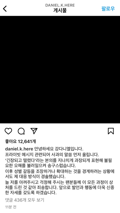 [흥미돋]강다니엘 사과문 작성자LKjhgfdsa|작성시간22.07.20|조회수59,322 목록 댓글 423 글자크기 작게가 글자크기 크게가 출처 : 여성시대 LKjhgfdsa 다음검색 현재 게시글 추가 기능 열기 북마크 공유하기 신고 센터로 신고 댓글 댓글 423 댓글쓰기 답글쓰기 댓글 리스트 작성자오쪼쪼,,나으자근나비야,, | 작성시간 22.07.21 논란씬에서 잔뼈 굵은 사람이네 작성자SATURN | 작성시간 22.07.21 그냥 티비에 나오지 말아주세요 작성자짝찌저버리갰읍니다 | 작성시간 22.07.21 니옐니옐~ 작성자ㅇI상한 검사 우병우 | 작성시간 22.07.22 경솔하다 경솔해 작성자어른되기싫어요 | 작성시간 22.07.22 뭐래 진짜ㅋㅋ 논란되면 사과하고 쯧쯧 댓글 전체보기