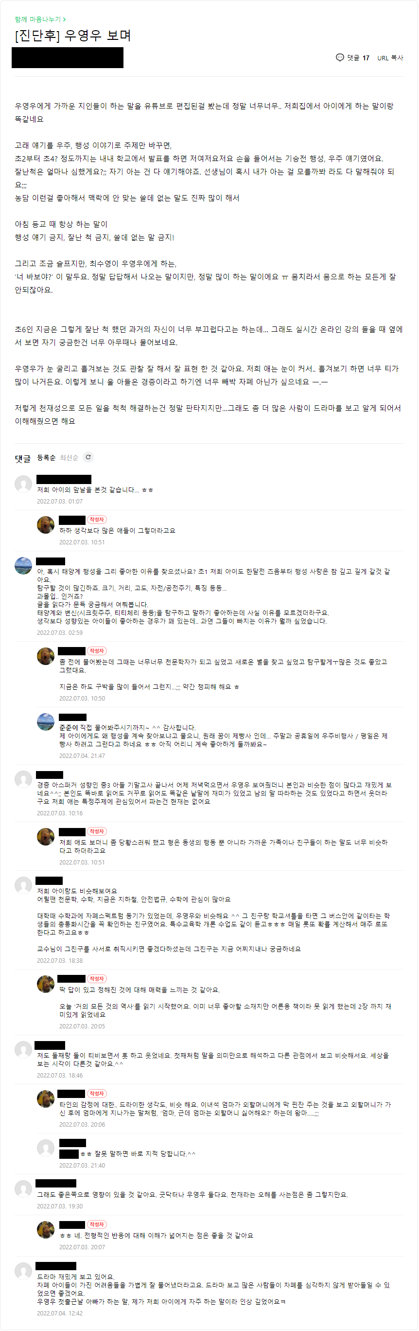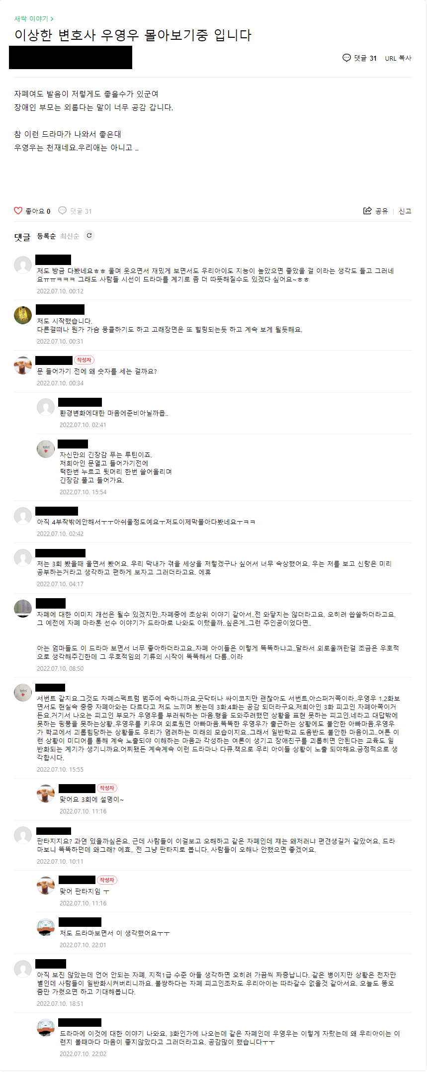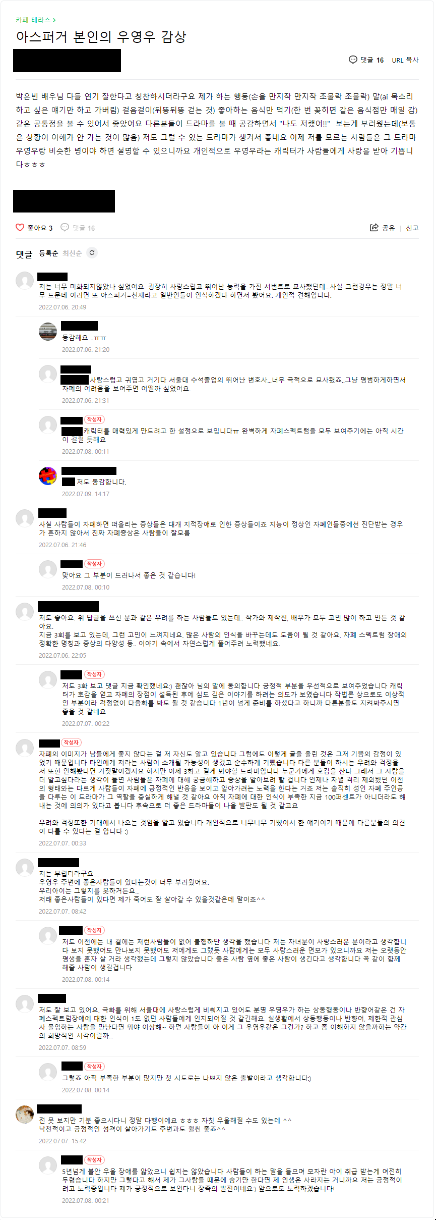 작성자러너 작성시간 22.07.21 공통적으로 말씀하시는게 자폐인 주변에 정명석이나 동그라미 같은 사람이 있는게 부럽다고 하시네 ㅜㅜ 어렵겠지만 이 드라마가 사람들이 마음을 여는 계기가 될거라고 생각해