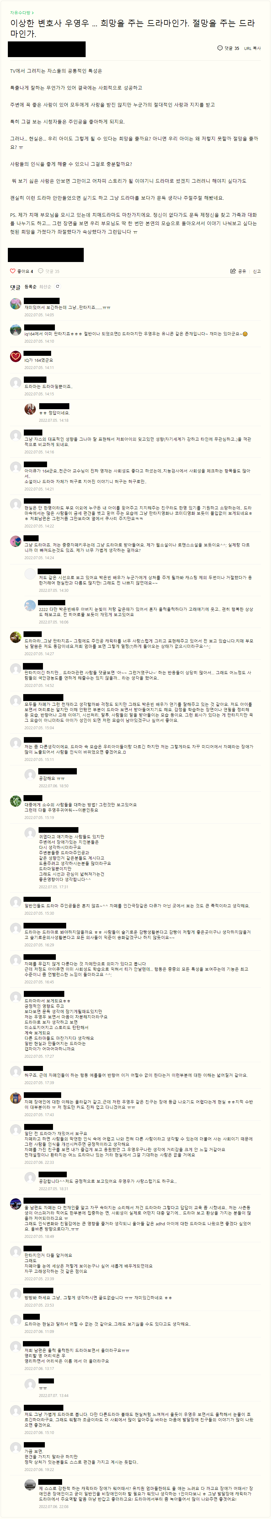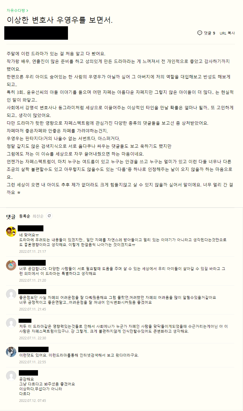 대체로 인식 변화 때문에 긍정적인 글이 더 많은것 같습니다