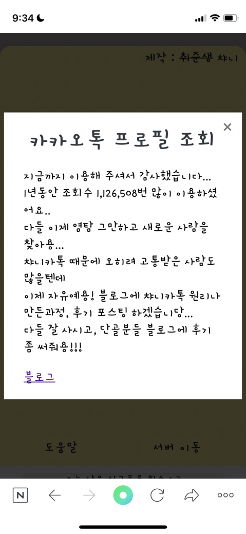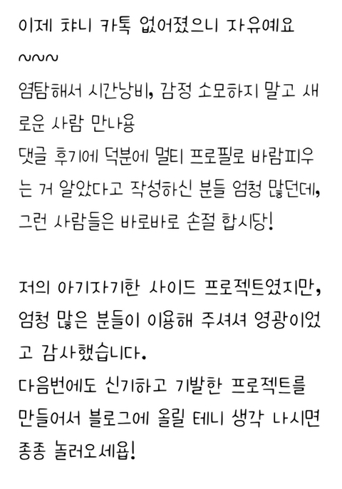 [흥미돋]챠니카톡 오늘부로 문닫음 작성자수납용|작성시간22.07.22|조회수23,348 목록 댓글 32 글자크기 작게가 글자크기 크게가 출처 : 여성시대 수납용차단당했는지 보려고 많이들 이용했을텐데(나도 여시로알았고) 카카오톡에서 눈치까고 두달동안 정지먹였대.. 그렇기도하고 이제 취준생아니고 직장인되서 시간투자도 못한다함 만든 원리는 다음에 블로그 포스팅한다니 궁금한여시들은 블로그놀러가면될듯.. +근데뭔가 마지막말 나한테하는말같아서 시원섭섭.. 이제진짜 염탐안하려고나도🥲 다음검색 현재 게시글 추가 기능 열기 북마크 공유하기 신고 센터로 신고 댓글 댓글 32 댓글쓰기 답글쓰기 댓글 리스트 작성자오니기리대가리 | 작성시간 22.07.22 할 나도궁금해졋음 작성자Brooklyn | 작성시간 22.07.22 저 사람 이거 포폴로 쓰면 굿이겠다 작성자뭉준휘 | 작성시간 22.07.23 으악 왜 이제 알았지 좀 싫다 작성자비빔명 | 작성시간 22.07.23 덕분에 사람 하나 잘 거르게 됐어.. 작성자정말 좋아해 | 작성시간 22.07.23 헐 없어져서 다행이다... 나 여자친구사진해놨는데............멀티프로필에......... 댓글 전체보기