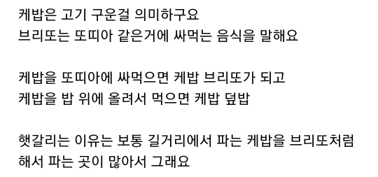 케밥 : 터키아저씨가 고기썰어서 넣어서 똘똘 말아주는거