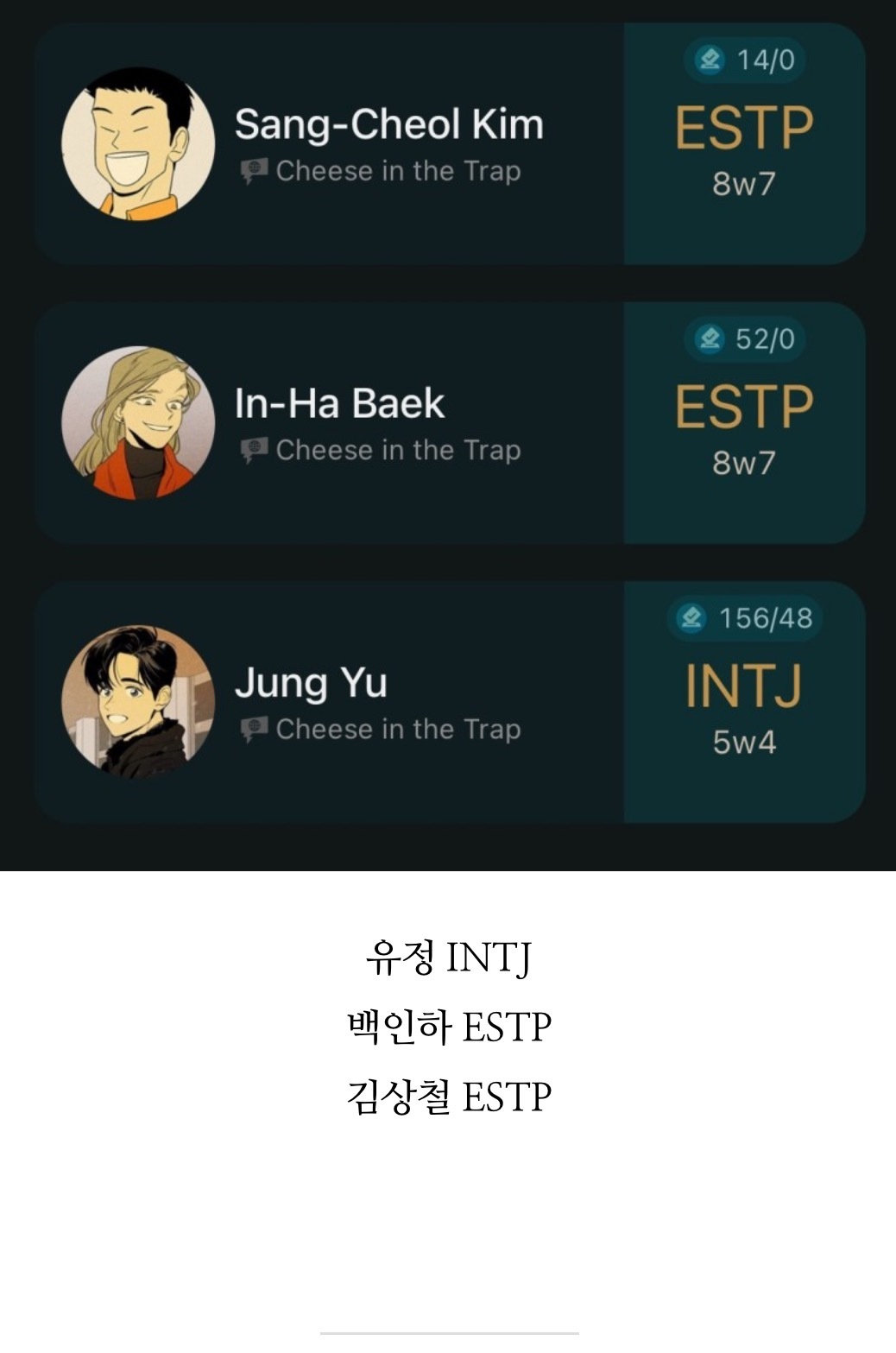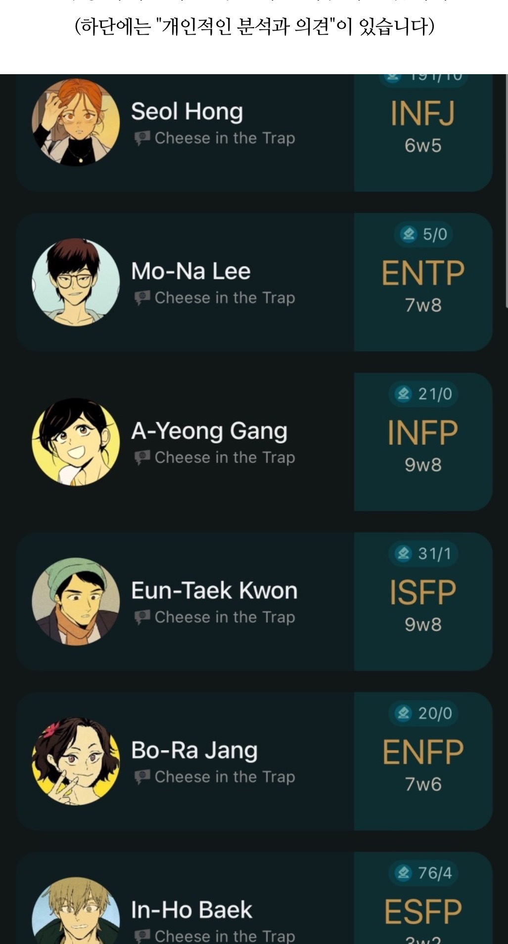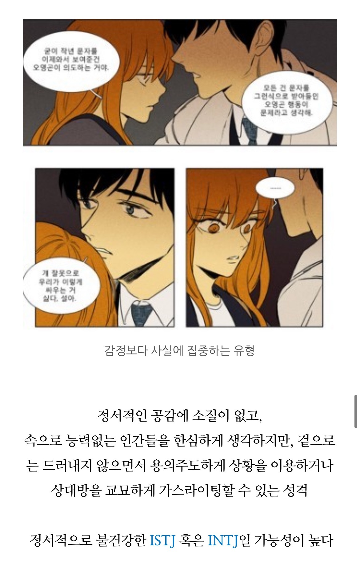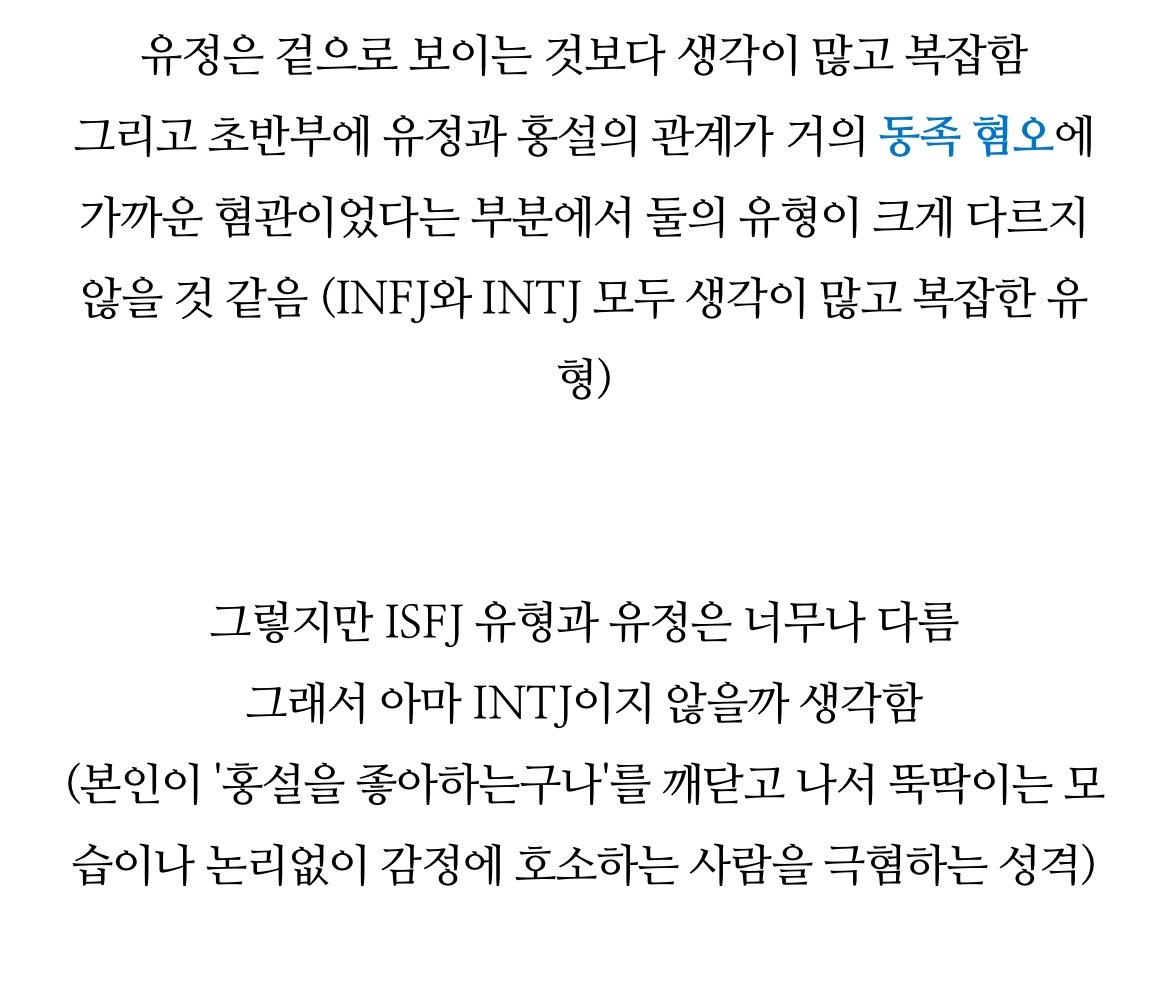 [흥미돋]치즈인더트랩(치인트) 등장인물의 MBTI 유형 분석 (feat. 홍설, 유정) 작성자퓨전|작성시간22.07.26|조회수7,914 목록 댓글 18 글자크기 작게가 글자크기 크게가 출처 : https://m.blog.naver.com/tmddus516/222638966047웹툰 "치즈인더트랩(치인트)" 등장인물의 MBTI 유형 분석 (긴글주의)웹툰 작가님의 공식 오피셜이 아닌 점을 미리 고지합니다. (애초에 웹툰이기 때문에 공식 오피셜 조차도 정...blog.naver.com 다음검색 현재 게시글 추가 기능 열기 북마크 공유하기 신고 센터로 신고 댓글 댓글 18 댓글쓰기 답글쓰기 댓글 리스트 작성자숭늉g | 작성시간 22.07.26 다공감간다 ㅋㅋ 작성자어찌하리오리까리 | 작성시간 22.07.26 홍설 ㄹㅇ ㅋㅋㅋ유정도 ㅋㅋㅋㅋ 작성자난 이렇게 살아왔는데 | 작성시간 22.07.26 아영! 반갑다 작성자코코아바나나 | 작성시간 22.07.26 아이 하필 김상철이랑 백인하얔ㅋㅋㅋㅋㅋㅋㅋㅋㅋㅋㅋ 작성자파란하늘보리 | 작성시간 22.07.26 모르는 사람들이랑만 같다 ㅋㅋㅋㅋ케 댓글 전체보기