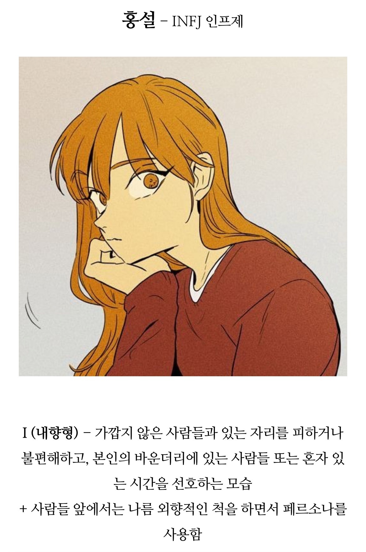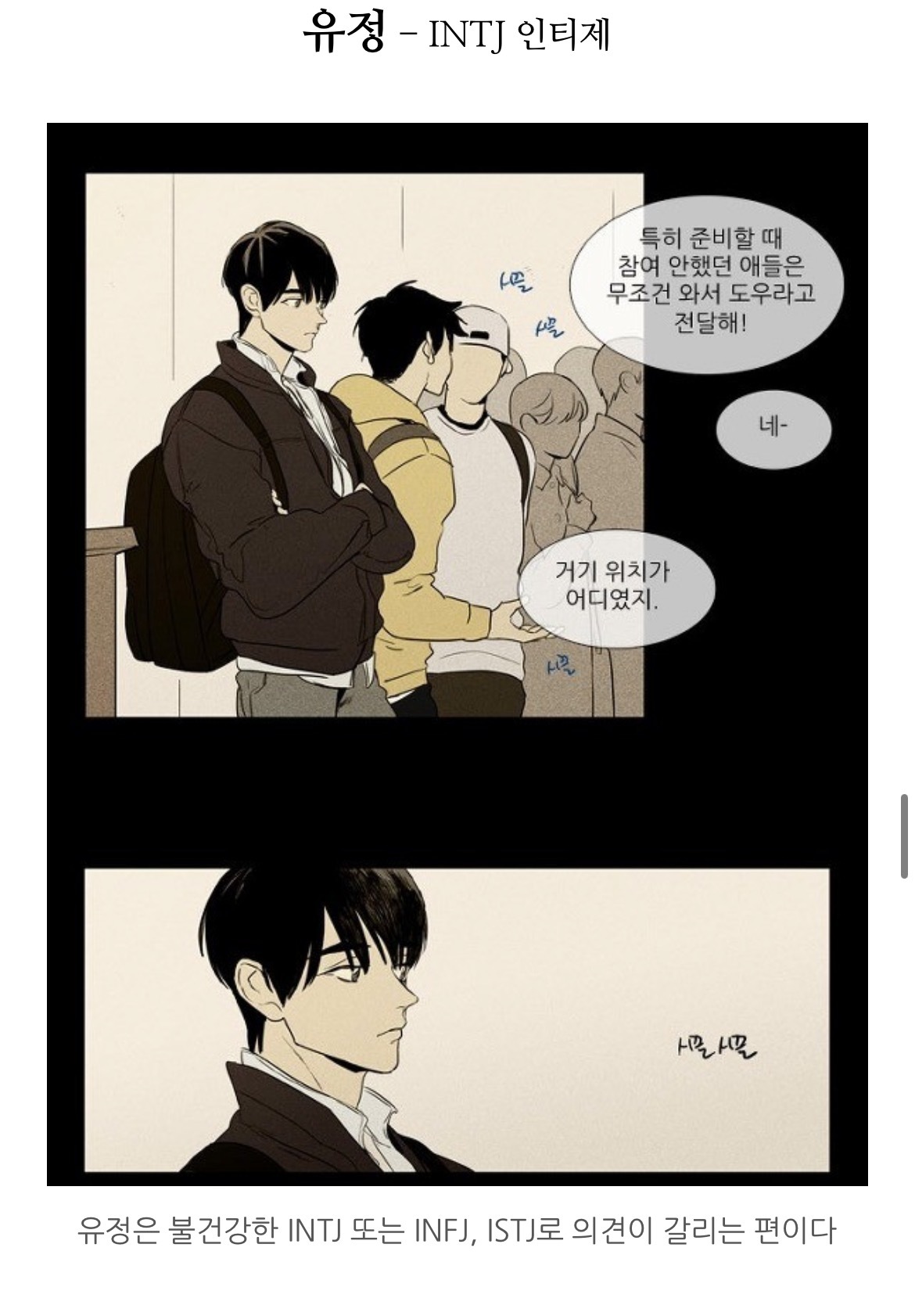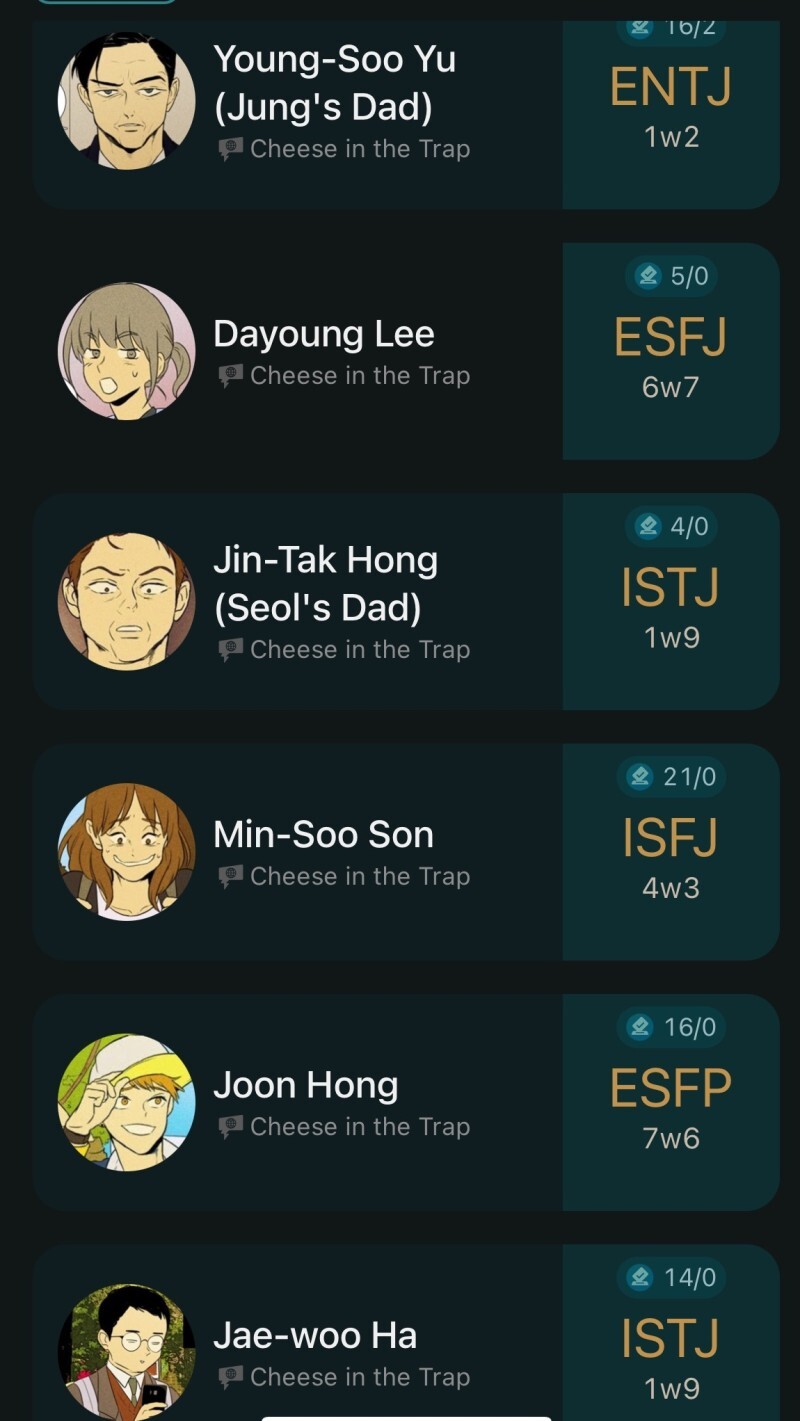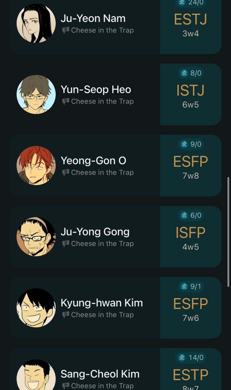 [흥미돋]치즈인더트랩(치인트) 등장인물의 MBTI 유형 분석 (feat. 홍설, 유정) 작성자퓨전|작성시간22.07.26|조회수7,914 목록 댓글 18 글자크기 작게가 글자크기 크게가 출처 : https://m.blog.naver.com/tmddus516/222638966047웹툰 "치즈인더트랩(치인트)" 등장인물의 MBTI 유형 분석 (긴글주의)웹툰 작가님의 공식 오피셜이 아닌 점을 미리 고지합니다. (애초에 웹툰이기 때문에 공식 오피셜 조차도 정...blog.naver.com 다음검색 현재 게시글 추가 기능 열기 북마크 공유하기 신고 센터로 신고 댓글 댓글 18 댓글쓰기 답글쓰기 댓글 리스트 작성자숭늉g | 작성시간 22.07.26 다공감간다 ㅋㅋ 작성자어찌하리오리까리 | 작성시간 22.07.26 홍설 ㄹㅇ ㅋㅋㅋ유정도 ㅋㅋㅋㅋ 작성자난 이렇게 살아왔는데 | 작성시간 22.07.26 아영! 반갑다 작성자코코아바나나 | 작성시간 22.07.26 아이 하필 김상철이랑 백인하얔ㅋㅋㅋㅋㅋㅋㅋㅋㅋㅋㅋ 작성자파란하늘보리 | 작성시간 22.07.26 모르는 사람들이랑만 같다 ㅋㅋㅋㅋ케 댓글 전체보기