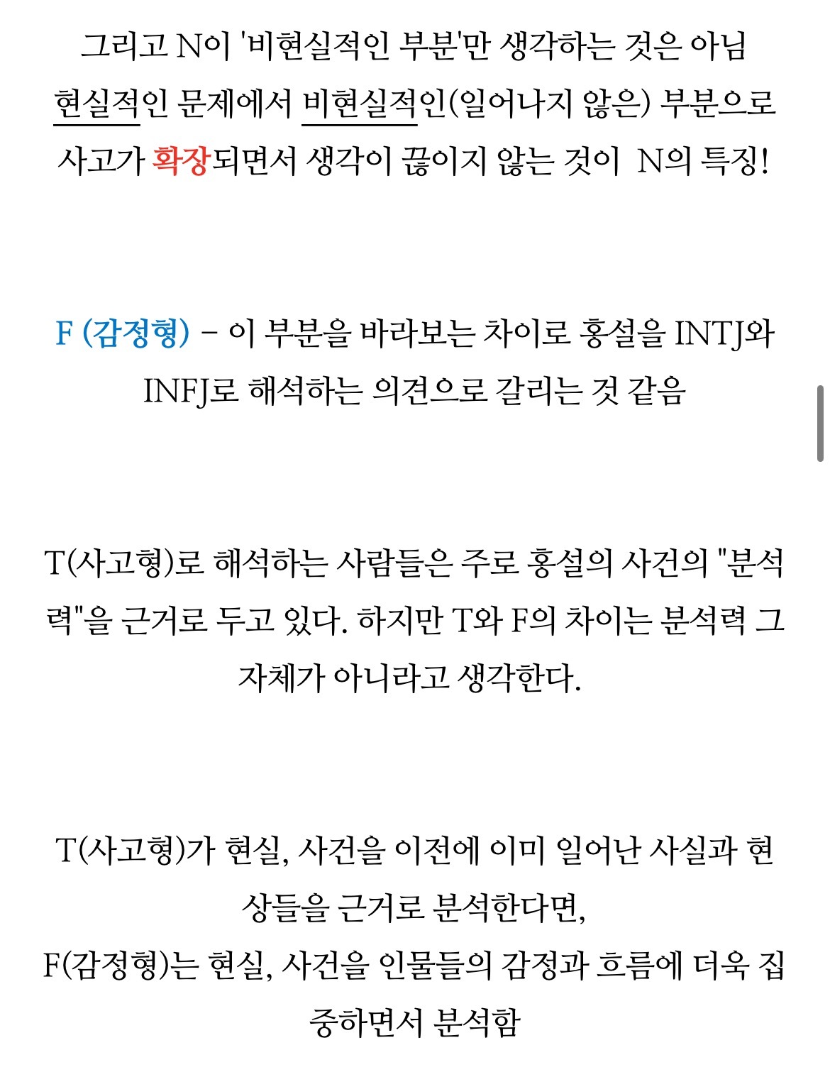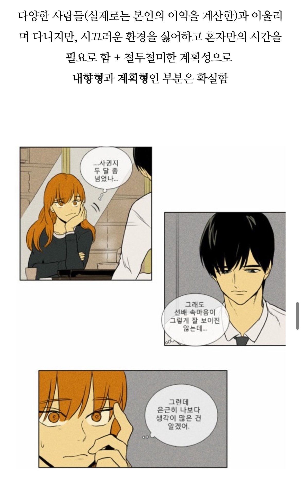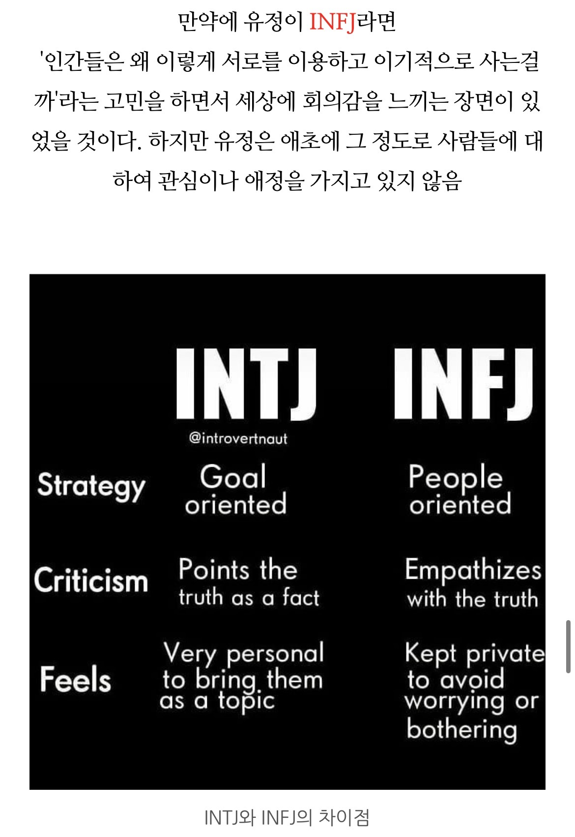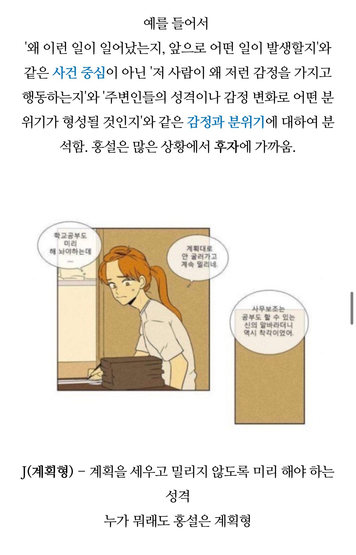 [흥미돋]치즈인더트랩(치인트) 등장인물의 MBTI 유형 분석 (feat. 홍설, 유정) 작성자퓨전|작성시간22.07.26|조회수7,914 목록 댓글 18 글자크기 작게가 글자크기 크게가 출처 : https://m.blog.naver.com/tmddus516/222638966047웹툰 "치즈인더트랩(치인트)" 등장인물의 MBTI 유형 분석 (긴글주의)웹툰 작가님의 공식 오피셜이 아닌 점을 미리 고지합니다. (애초에 웹툰이기 때문에 공식 오피셜 조차도 정...blog.naver.com 다음검색 현재 게시글 추가 기능 열기 북마크 공유하기 신고 센터로 신고 댓글 댓글 18 댓글쓰기 답글쓰기 댓글 리스트 작성자숭늉g | 작성시간 22.07.26 다공감간다 ㅋㅋ 작성자어찌하리오리까리 | 작성시간 22.07.26 홍설 ㄹㅇ ㅋㅋㅋ유정도 ㅋㅋㅋㅋ 작성자난 이렇게 살아왔는데 | 작성시간 22.07.26 아영! 반갑다 작성자코코아바나나 | 작성시간 22.07.26 아이 하필 김상철이랑 백인하얔ㅋㅋㅋㅋㅋㅋㅋㅋㅋㅋㅋ 작성자파란하늘보리 | 작성시간 22.07.26 모르는 사람들이랑만 같다 ㅋㅋㅋㅋ케 댓글 전체보기