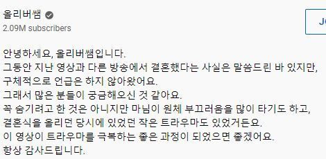 아래는 예전에 유튜브에서 결혼 사실 공개하면서