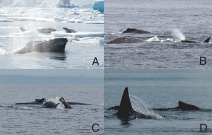 바다표범의 주위를 맴돌던 범고래 무리가 파도를 이용해 바다표범을 유빙 밖으로 밀어버림