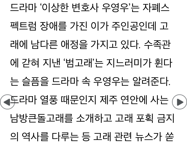 [여시뉴스데스크]이상한 변호사 우영우와 기후변화 뉴스 작성자아대하|작성시간22.08.02|조회수13,521 목록 댓글 2 글자크기 작게가 글자크기 크게가 출처 : http://www.mediatoday.co.kr/news/articleView.html?idxno=305204이상한 변호사 우영우와 기후변화 뉴스 - 미디어오늘드라마 ‘이상한 변호사 우영우’는 자폐스펙트럼 장애를 가진 이가 주인공인데 고래에 남다른 애정을 가지고 있다. 수족관에 갇혀 지낸 ‘범고래’는 지느러미가 휜다는 상식을 드라마 속 우www.mediatoday.co.kr 다음검색 현재 게시글 추가 기능 열기 북마크 공유하기 신고 센터로 신고 댓글 댓글 2 댓글쓰기 답글쓰기 댓글 리스트 작성자Svelte | 작성시간 22.08.02 좋은 기사인 거 같아 계기가 어떻게 됐든 자연 환경 보호에 조금 더 초점을 맞추고 꾸준히 자연 보호를 위해 살아가자 ! 작성자ㅇI상한 검사 우병우 | 작성시간 22.08.02 좋은 영향이다 댓글 전체보기