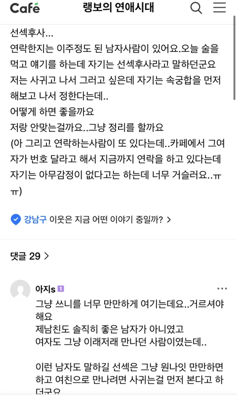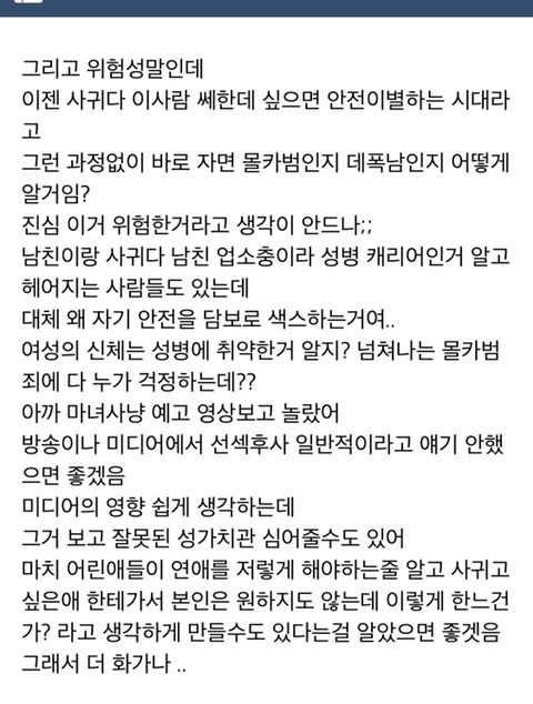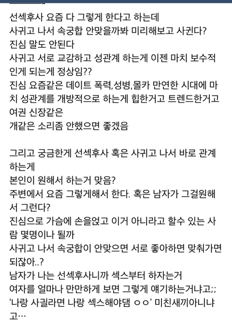작성자딤딤@ 작성시간 22.08.04 아니 뭘믿고 자냔말임 ㅠㅠ 성병 걱정 안돼...? 사귀고 알아가고 확신이 들때 자는게 아니야 요즘은?