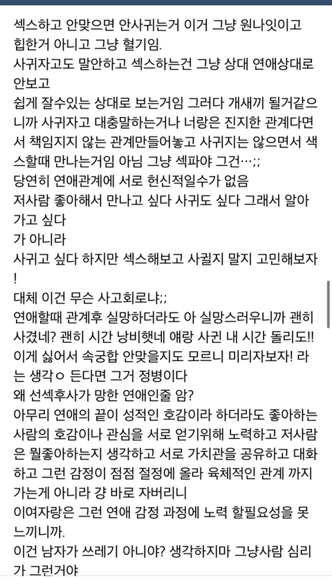작성자우유지요 작성시간 22.08.04 여자만 손해.. 원래 섹스라는 서로의 모든 신체 약점을 다 노출하면서 자식 출산에까지 이를 수 있는 단계의 행위에 이르려면 서로를 검증하고 신뢰할 수 있게 되기까지의 시간이 필요한데 특히 임신 출산을 오롯이 떠안아야 하는 여자 입장에서 더 필요한 과정인데 누구 좋으라고 그걸 다 거름..