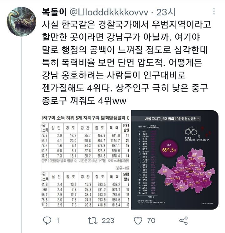 작성자요거트푸푸 작성시간 22.08.05 …? 어 근데 당연히 범죄 발생지랑 범죄자 거주지는 다른 개념 아닌가.. 내가 도둑이어도 강남 가서 일할거 같은데;;