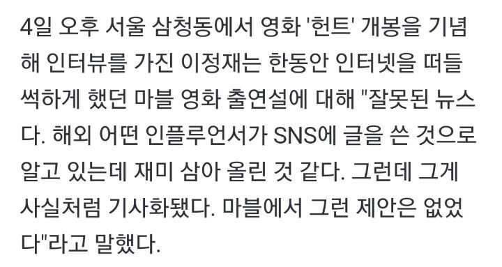 [여시뉴스데스크]이정재 "마블 영화 출연설은 오보, 제안 없었다" 작성자김 재영|작성시간22.08.05|조회수2,164 목록 댓글 11 글자크기 작게가 글자크기 크게가 출처 : https://n.news.naver.com/entertain/article/416/0000286227이정재 "마블 영화 출연설은 오보, 제안 없었다"배우 이정재가 마블 히어로 무비 출연설을 일축했다. 4일 오후 서울 삼청동에서 영화 '헌트' 개봉을 기념해 인터뷰를 가진 이정재는 한동안 인터넷을 떠들썩하게 했던 마블 영화 출연설에 대해 "n.news.naver.com 다음검색 현재 게시글 추가 기능 열기 북마크 공유하기 신고 센터로 신고 댓글 댓글 11 댓글쓰기 답글쓰기 댓글 리스트 답댓글 작성자aisorbma | 작성시간 22.08.05 아 자존심상해 터졋넼ㅋㅋㅋㅋㅋㅋ 작성자걍걍중걍약 | 작성시간 22.08.05 연기잘하는데 영어를못하지안나 답댓글 작성자PLAYBOY | 작성시간 22.08.05 그래서인지 영어는 더빙한다는 소문까지 돌았어ㅋㅋㅋㅋ(어차피 캐릭터가 인격이 여러개라 발음도 다양해야해서?) 작성자삼화간장 | 작성시간 22.08.05 ㅇㅋㅇㅋ 알겠어~~~~~ 그래서무슨역이라구? 작성자176cm 장난즈 | 작성시간 22.09.10 스타워즈가 이거였노… 댓글 전체보기